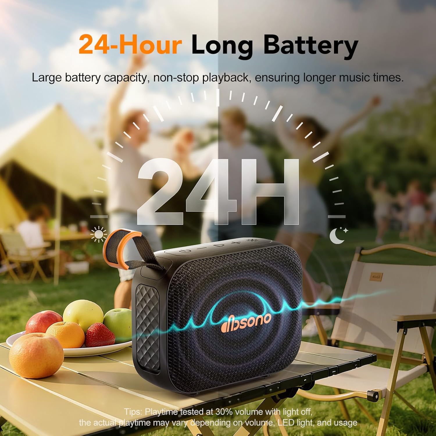 [Up to 24H Long-lasting Playtime] Built-in large battery that provides up to 24 hours of playtime in 30% volume with light off. Whether at a holiday party or on an outdoor camping trip, it will make you enjoy non-stop music all day. Tips: The actual playtime may vary depending on volume, LED light, and usage.