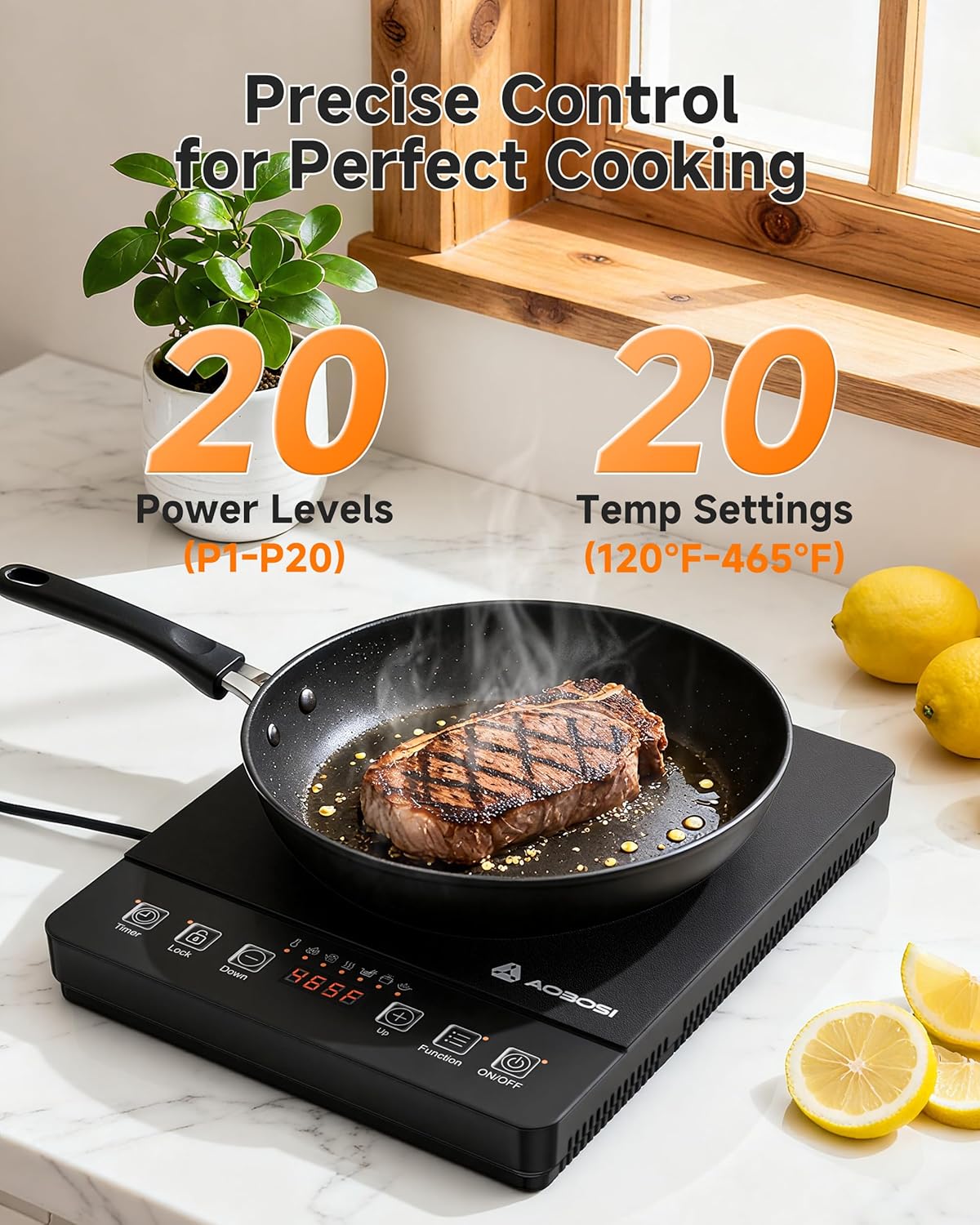 Precise Temperature Control:Features 20 power levels (P1–P20) and 20 temperature settings from 120°F to 465°F for precise control. Easily adjust to your cooking needs—from gentle simmering to high-heat searing.
