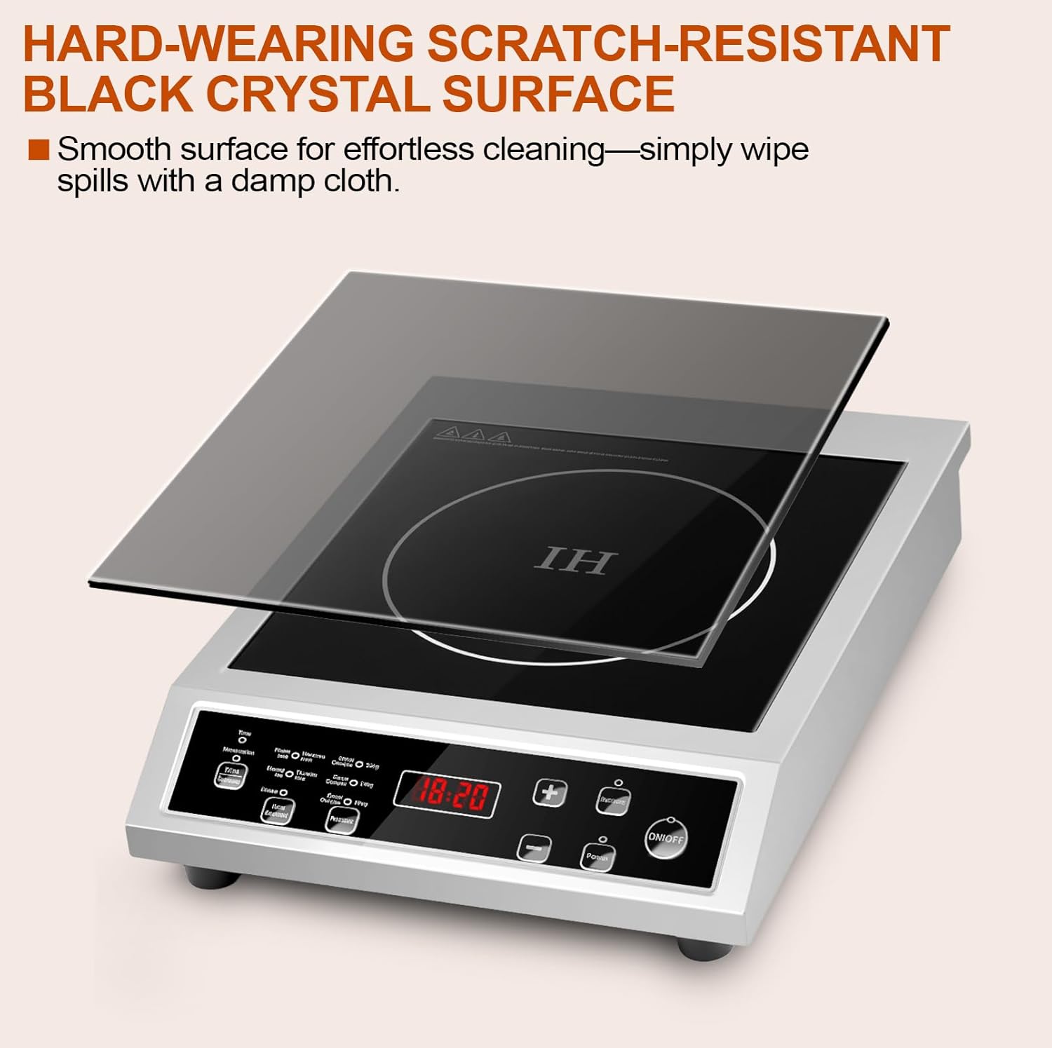 Easy to Use & Clean: Buttons provide clear tactile feedback, while the simple, intuitive LCD display ensures precise and efficient operation. The induction burner features a hard, scratch-resistant panel with a smooth surface that wipes clean effortlessly—simply use a damp cloth to remove any spills.