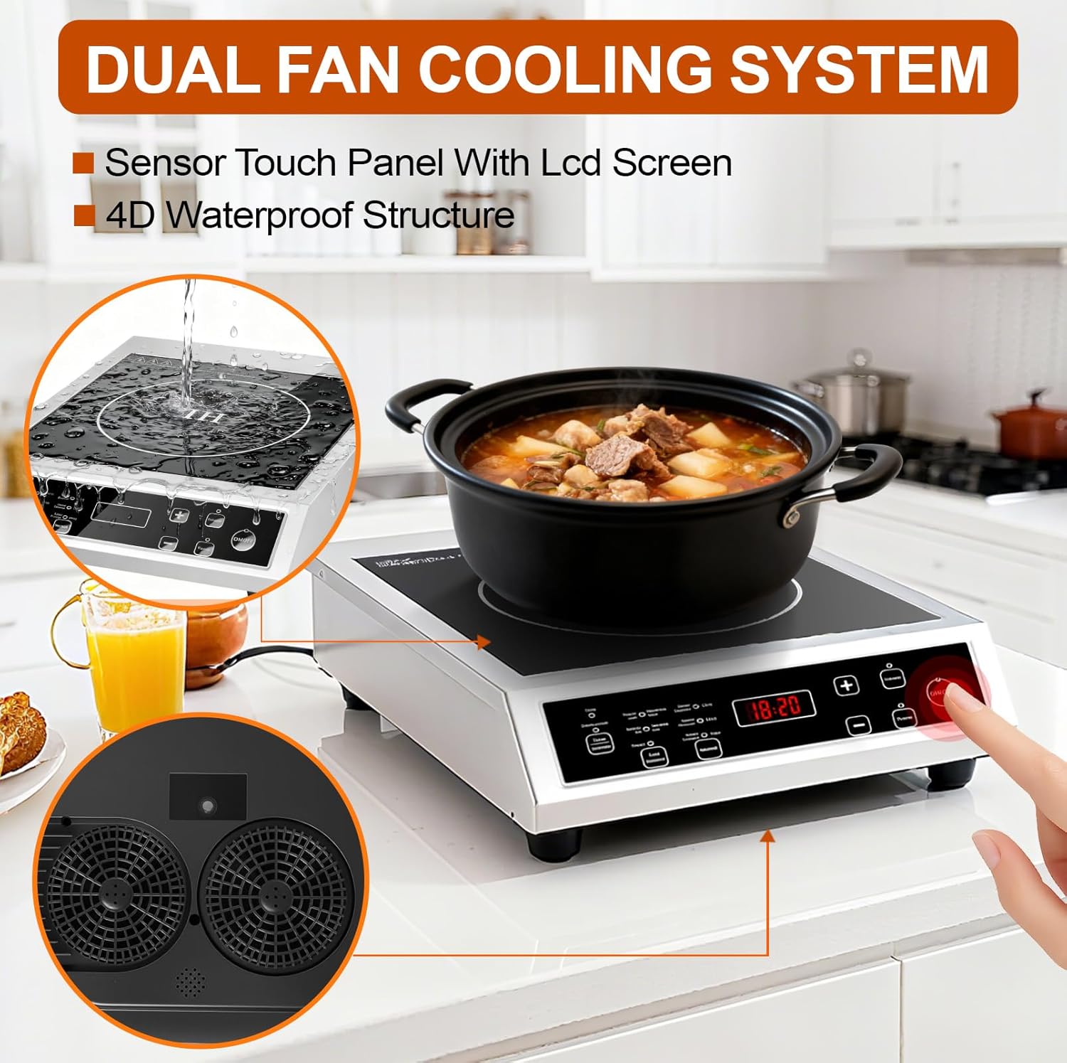 Dual Fan Cooling System: The portable induction cooktop incorporates an advanced dual-fan cooling system. High-frequency operation significantly enhances heat dissipation efficiency, ensuring the device consistently operates within safe temperature limits. This protects internal components and guarantees stable, long-lasting performance.