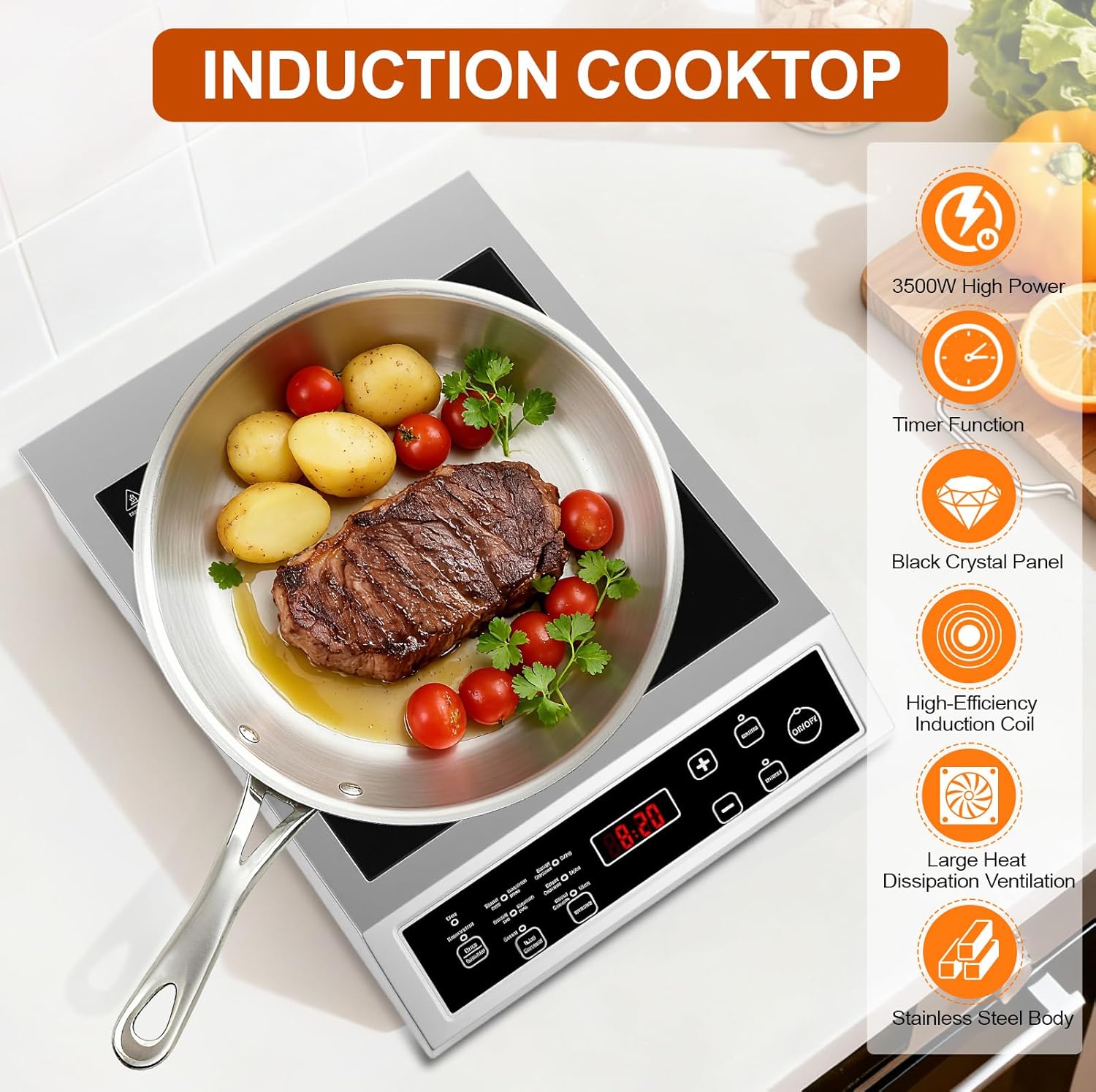 High Efficiency: The induction cooktop achieves up to 80% energy efficiency, outperforming traditional gas or electric stoves. It heats rapidly and shortens cooking times. Three practical modes are provided: a timer (up to 4 hours), 24-hour preset programming, and a 3500W rapid stir-fry function.
