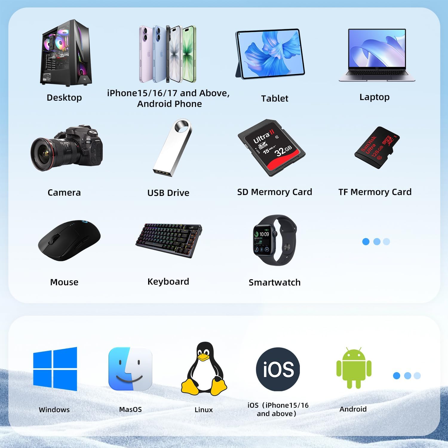 【Ultra-Slim & Portable, Broad Compatibility】 Weighing just 0.37 lbs (approx. 168g), it’s as slim as a business card holder and easily fits in your pocket or bag. Fully compatible with Windows, macOS, Linux, Android, and iOS systems, it works plug-and-play on desktops, laptops, smartphones, smart TVs, and even gaming consoles—no driver installation required.