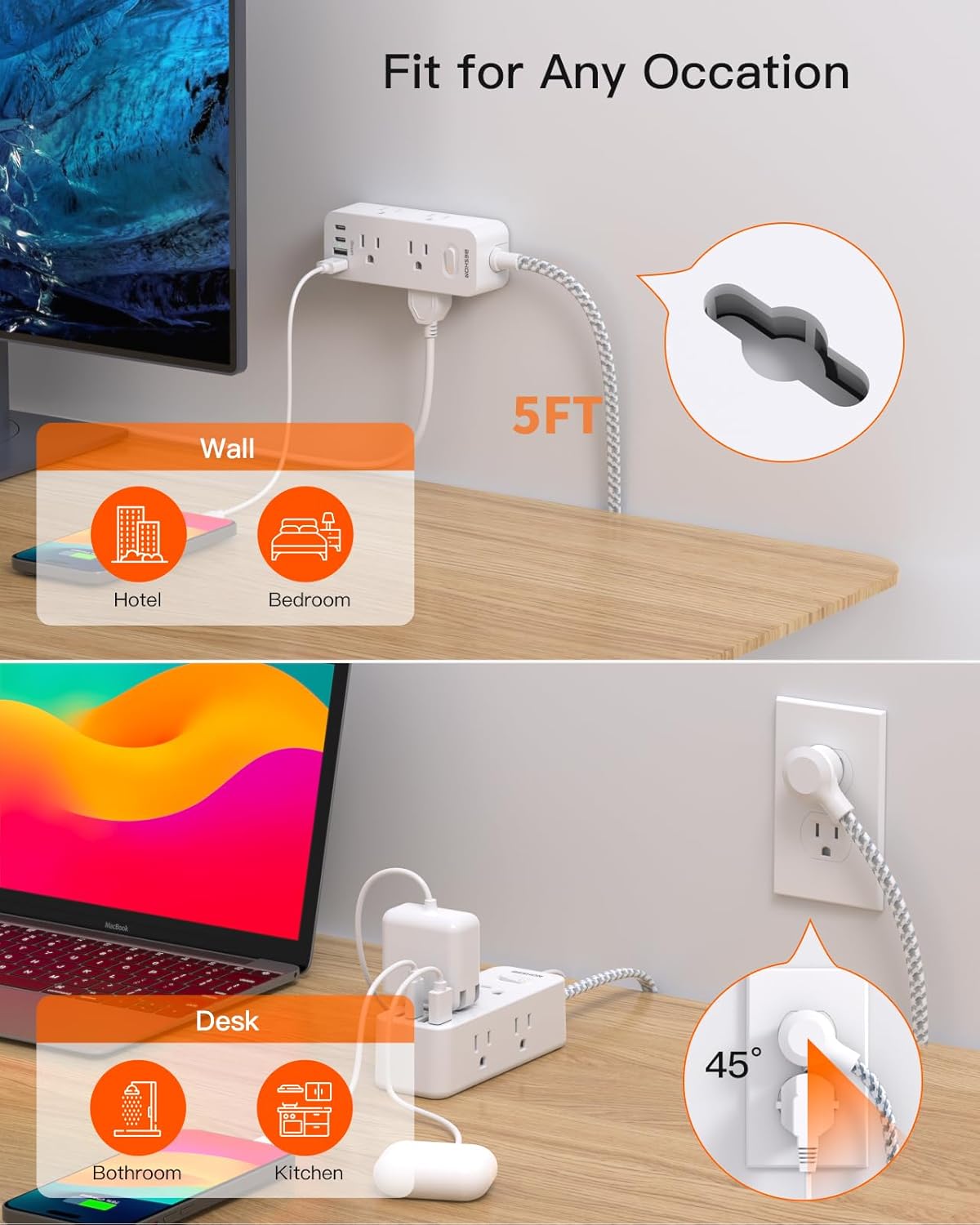 【3 Side Design & Wide Space Outlets】3-side design that makes it enough to fit big adapters and suitable for all kinds of equipment. and each AC outlet with 1.6 inches of space in between, is larger than a standard 1.5-inch socket. fit big adapters without blocking each other. The compact design saves more space, suitable for the travel, home, dorm room, and office