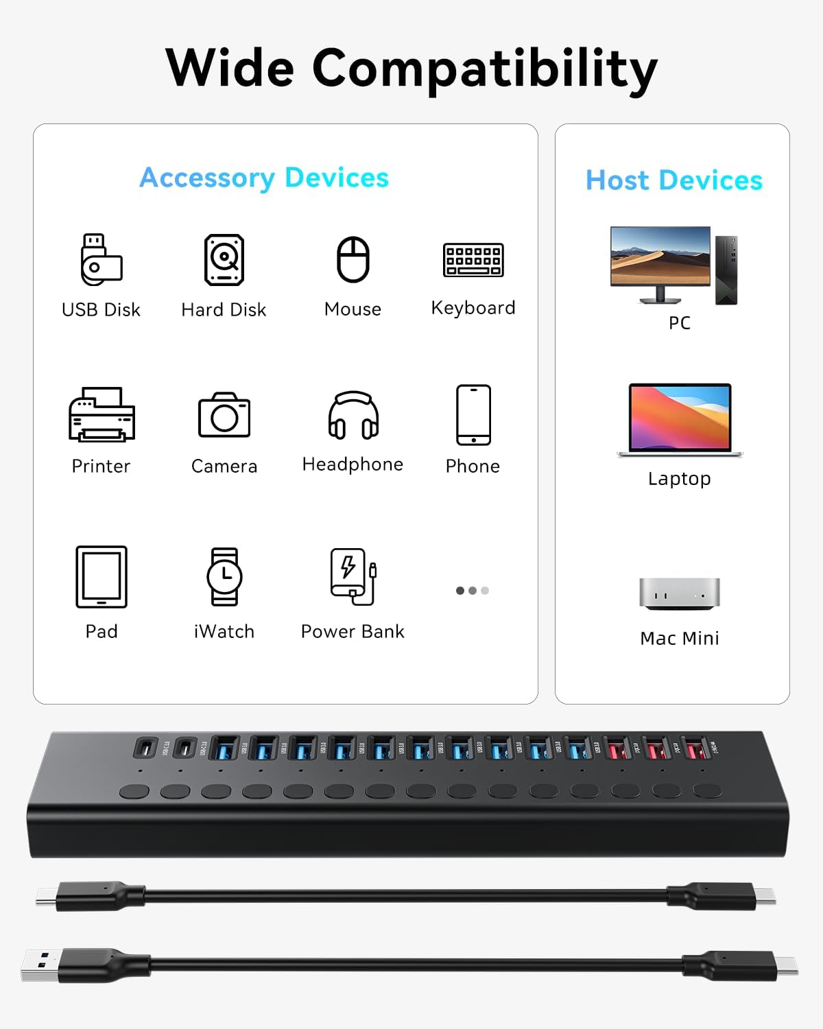 5Gbps High-Speed Data Transfer: This hub includes 10 USB-A 3.0 ports and 2 USB-C 3.0 ports, boasting data transfer speeds of up to 5Gbps-10 times faster than standard USB 2.0 hubs. Moreover, the USB 3.0 interface delivers a maximum power output of 5V/1.5A, sufficient for charging most USB-powered devices. You can transfer a full HD movie in just seconds, and it is backward compatible with USB 2.0 and USB 1.1 devices for versatile use.
