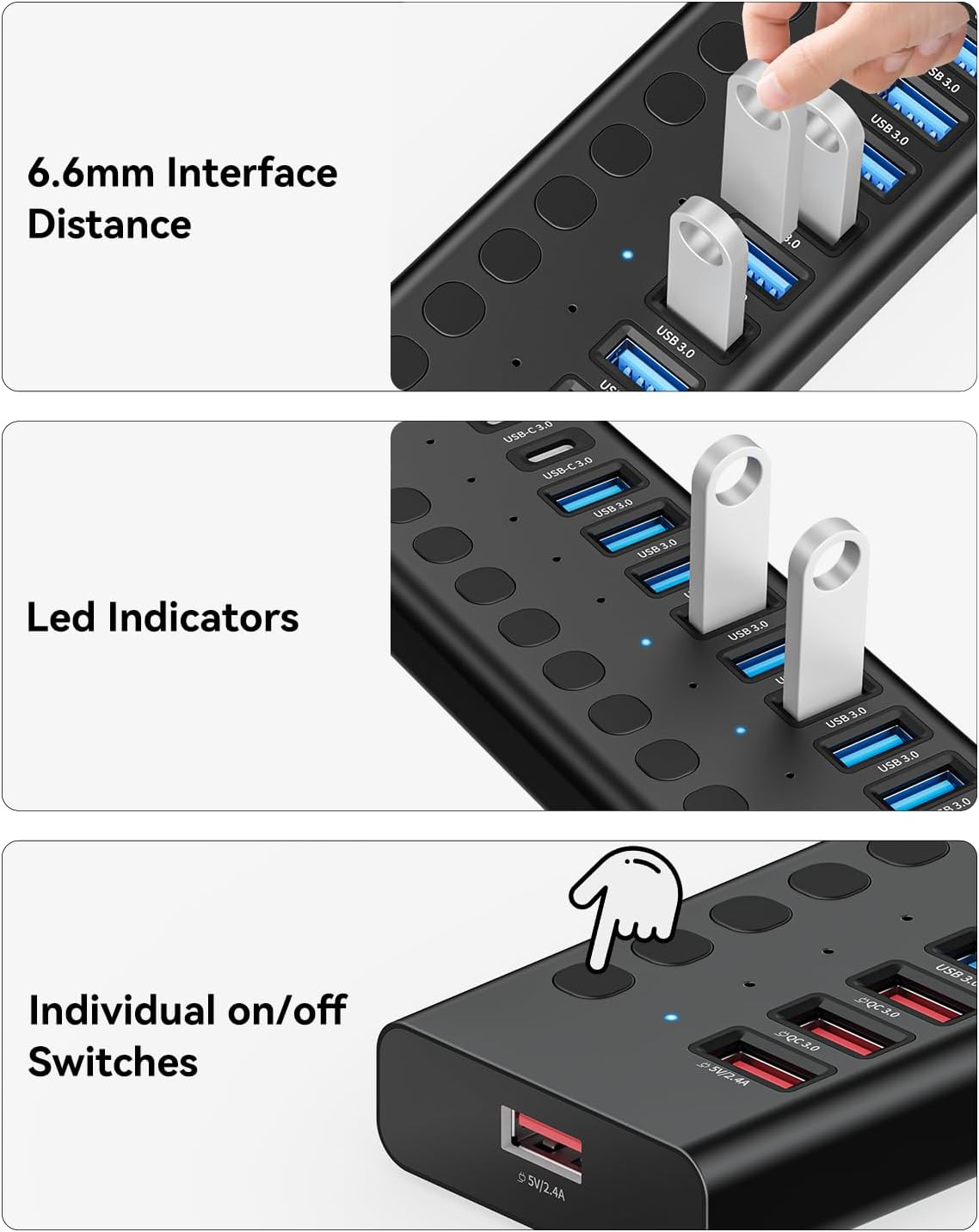 16 IN 1 Powered USB 3.0 Hub: The AGEEN Powered USB Hub is equipped with 10 USB-A 3.0 ports, 2 Quick Charging (QC 3.0) ports, 2 USB-A Smart Charging ports, and 2 USB-C 3.0 data transfer ports. The QC 3.0 ports deliver 24W power, while the Smart Charging ports provide 5V/2.4A power, ideal for charging smartphones, tablets, earbuds, smartwatches, and other compatible devices.