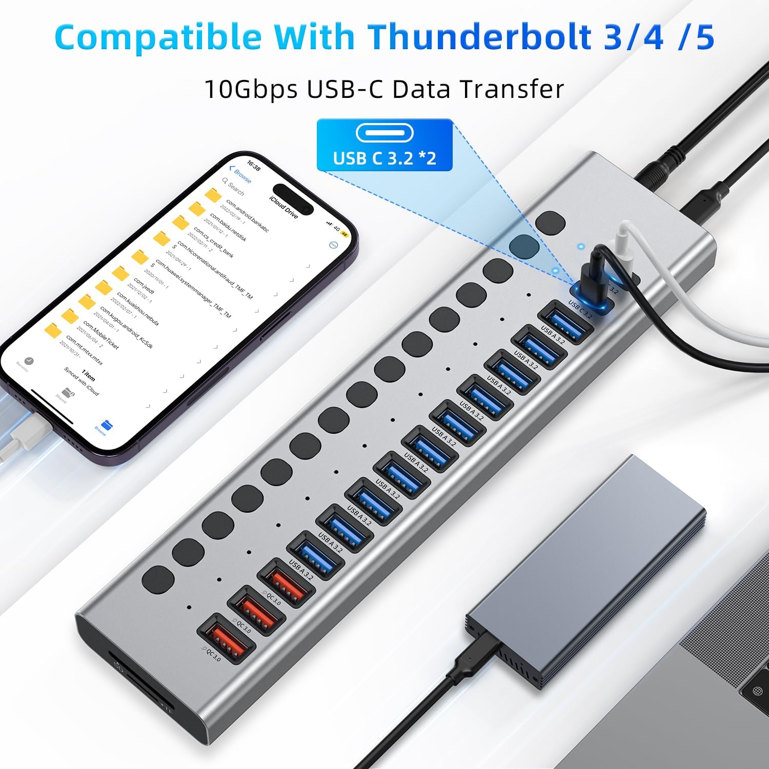 17 IN 1 Powered USB 3.2 Hub: VANGREE Powered USB Hub equips with 10 x USB-A 3.2 ports, 3 x USB-A QC3.0 (24W) fast charging ports, 2 x USB-C 3.2 ports, SD/TF card reader. Note: 3 fast charging ports do not support data transmission.