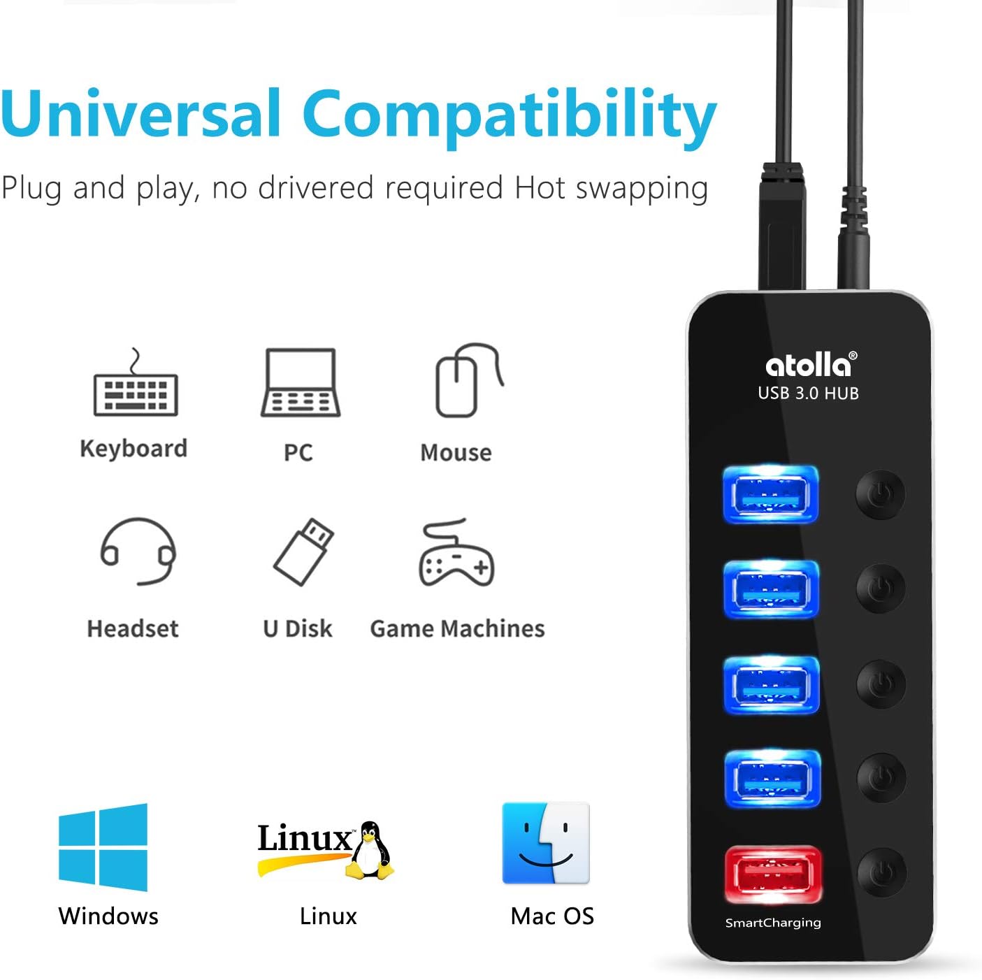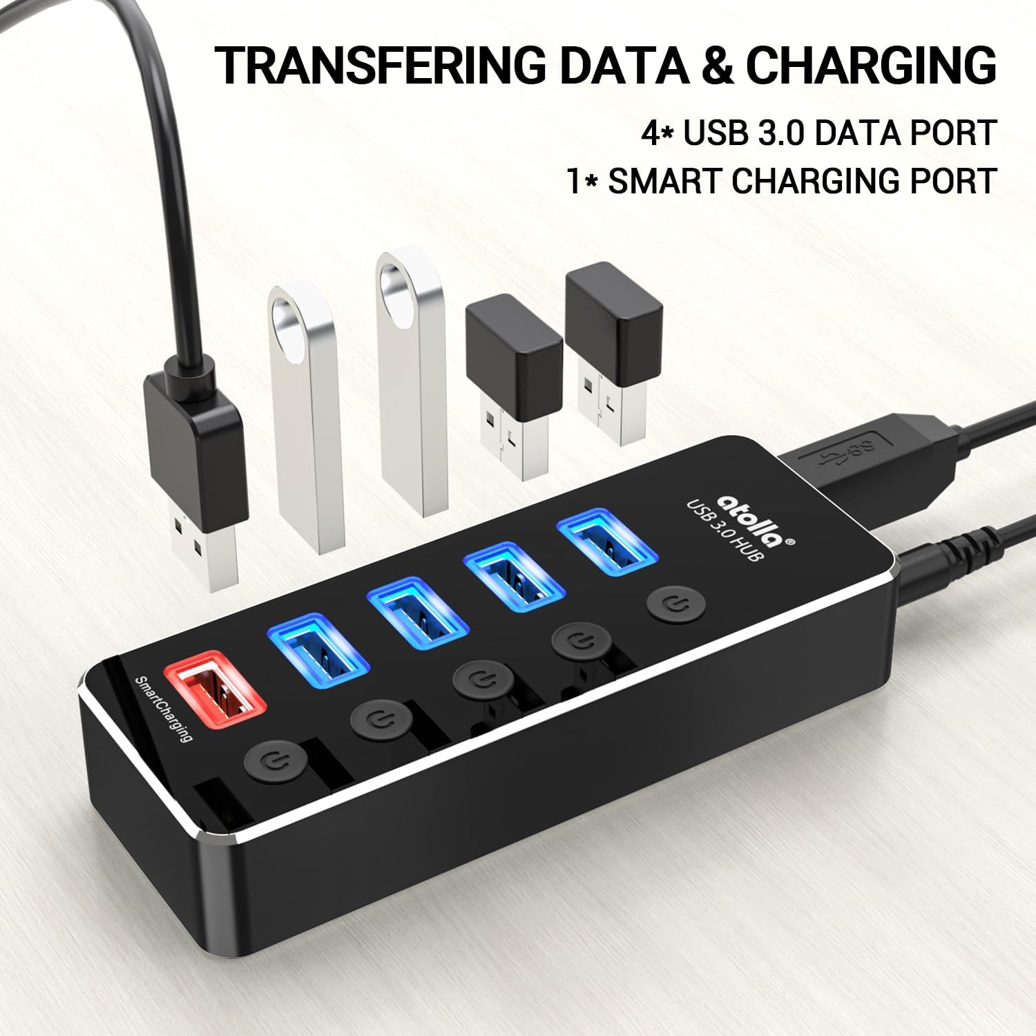 Powered USB Hub, atolla Aluminum 5-Port USB 3.0 Hub with 4 USB 3.0 Data Ports and 1 USB Smart Charging Port, USB Splitter with 5V/3A Power Adapter and Individual Switches