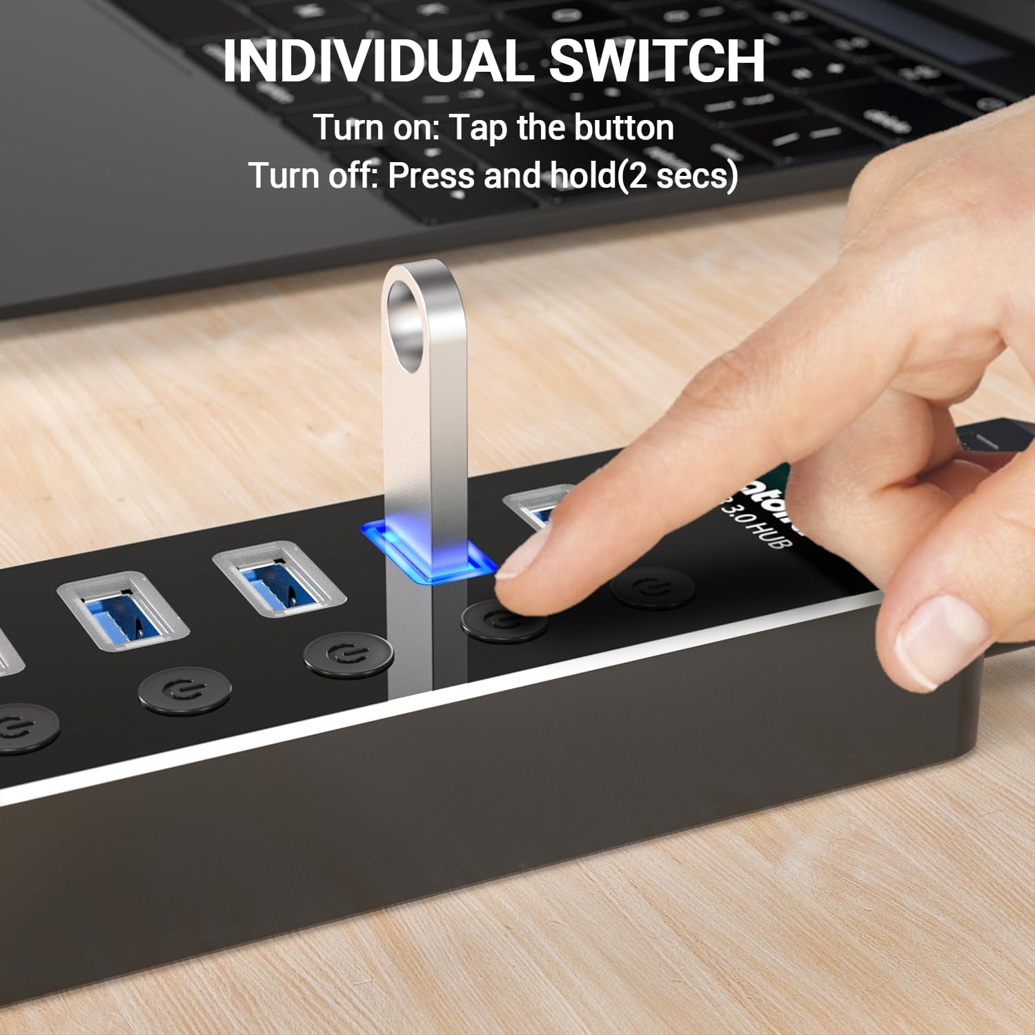Individual Switch with LED Indicator Choose to turn the device on/off without unplugging the device, making it easier to manage your USB devices.LED indicators make it easier for you to recognize on/off of the USB ports.Turn on: tap the buttonTurn off: press and hold for 2s