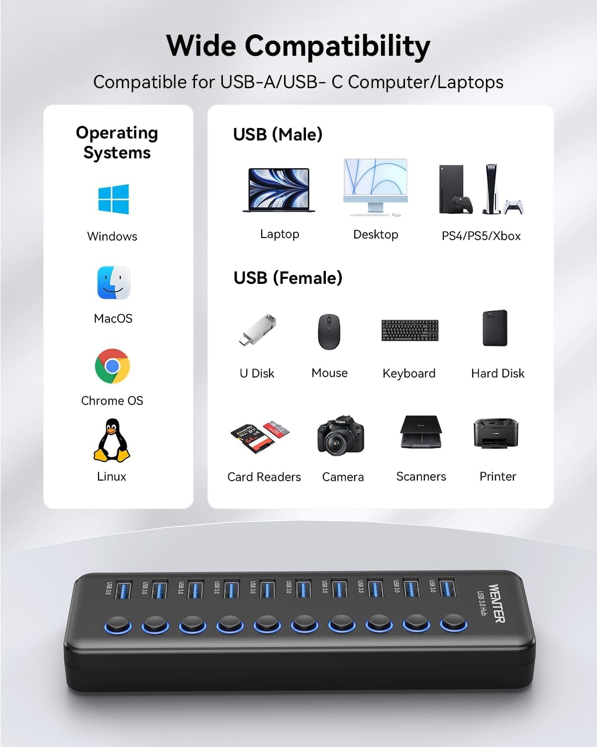 【Package & Warranty】 The WENTER powered 10-port USB 3.0 hub comes with one 12V/3A AC power adapter, one USB 3.0 A male to B male cable, and one user manual. Our powered USB extension hub is supported by an extensive 12-month warranty, which demonstrates our confidence in its quality. If you come across any issues or have any questions, please feel free to contact us promptly.