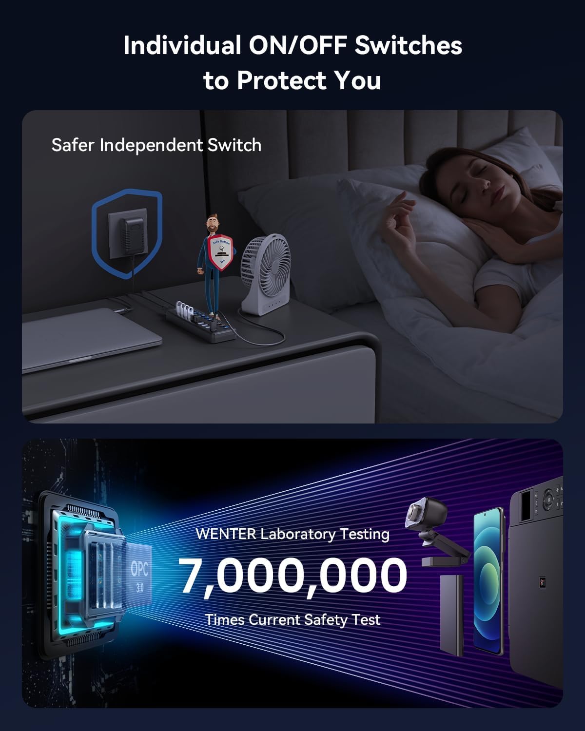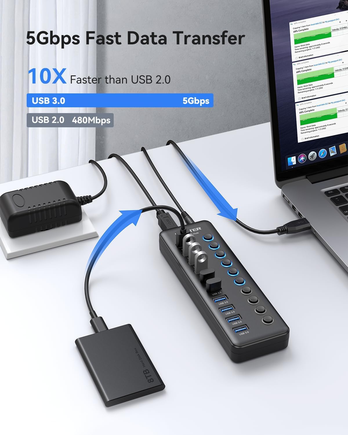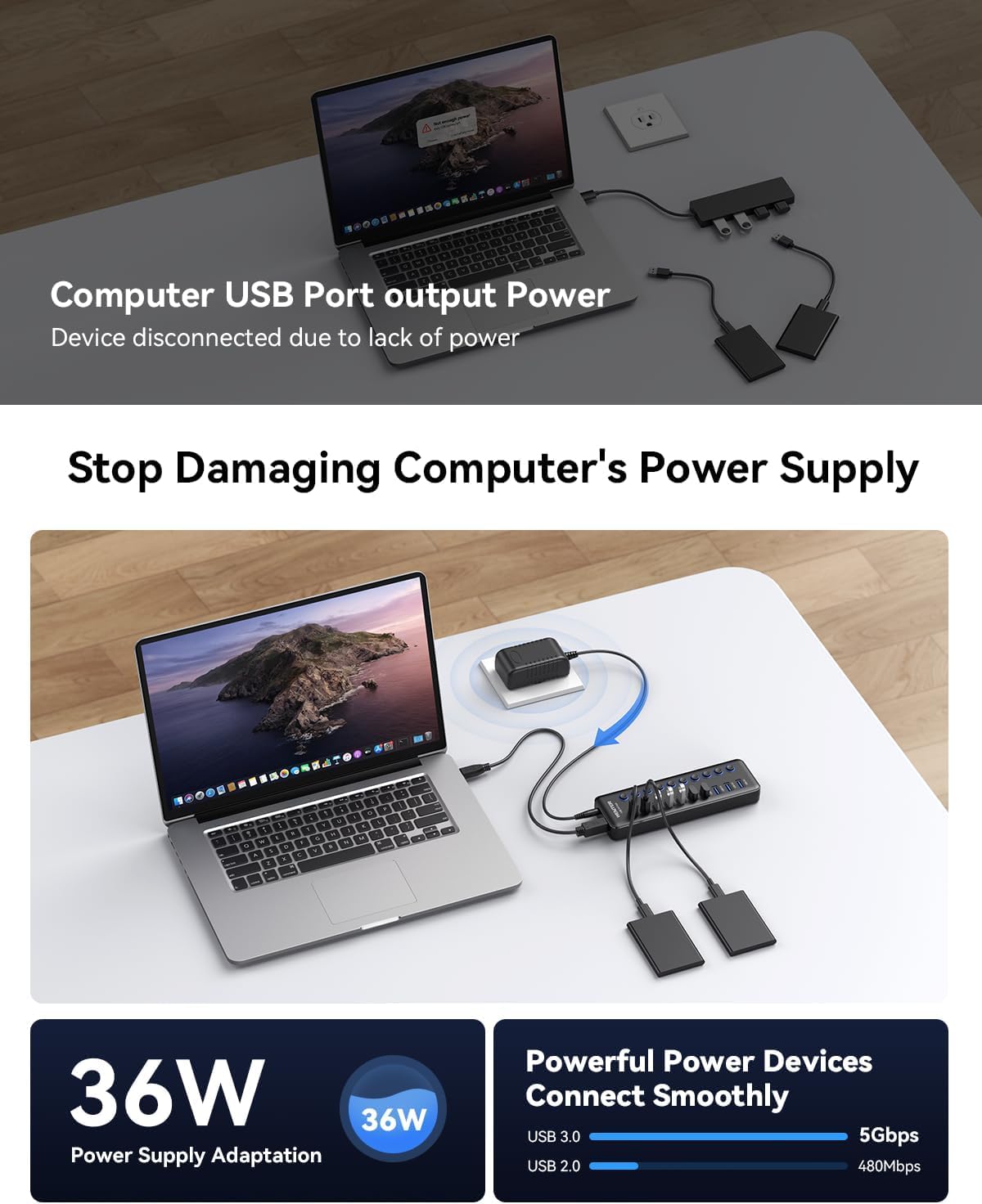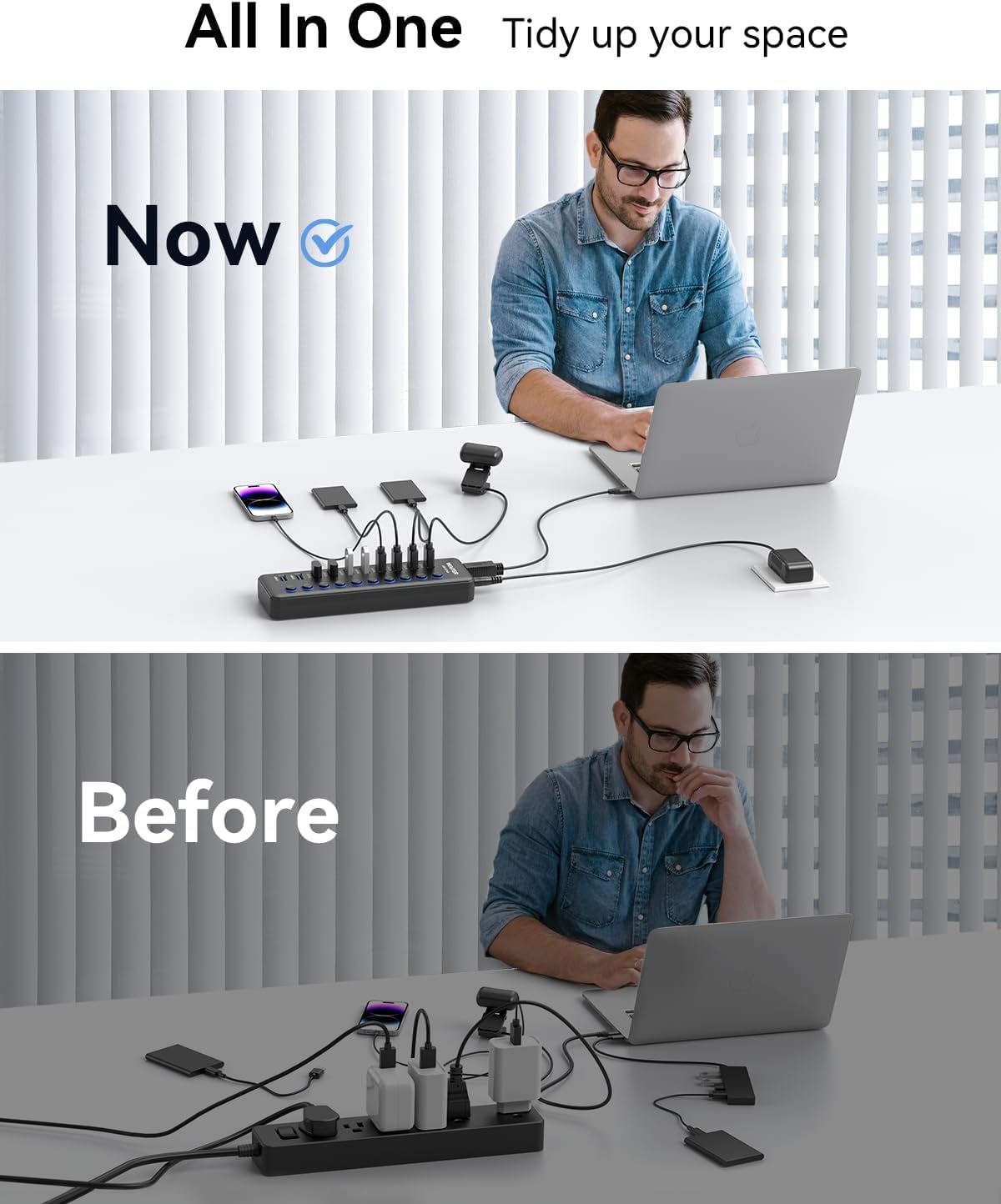 【For Individual Switches】 This powered USB hub is equipped with independent on-off switches for each USB port. You have the flexibility to activate or deactivate specific devices whenever necessary. This powered USB 3 hub eliminates the hassle of dealing with cable mess and lets you have full control over your workstation.