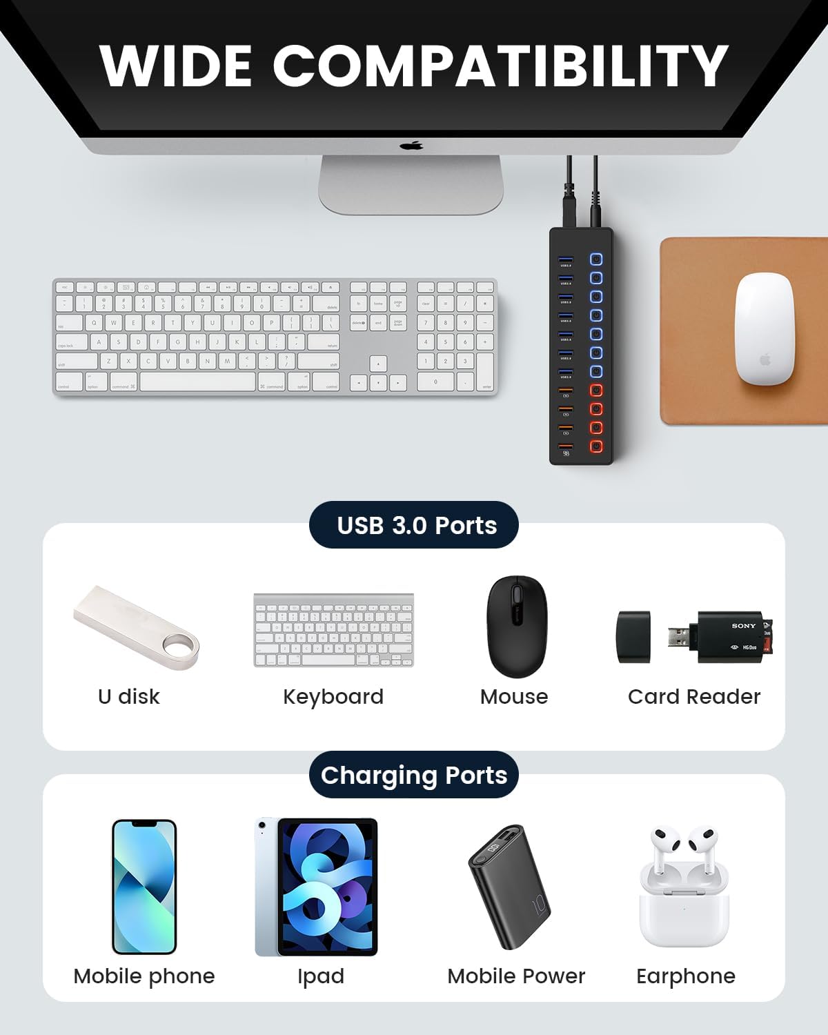 Usb port hub compatible device:USB port 3.0 is used for keyboards, mice, printers, hard disks, USB flash drives and other USB devices. The charging port can provide up to 2.4 amps of charging current for your iPhone, iPad, AirPods and camera. Usb 3.0 hub is compatible with Windows 8/10/11, Mac OS, Linux 2.6.14 or higher, supports any USB 3.0, USB 2.0, USB 1.1 and USB 1.0 peripherals, and supports hot plug