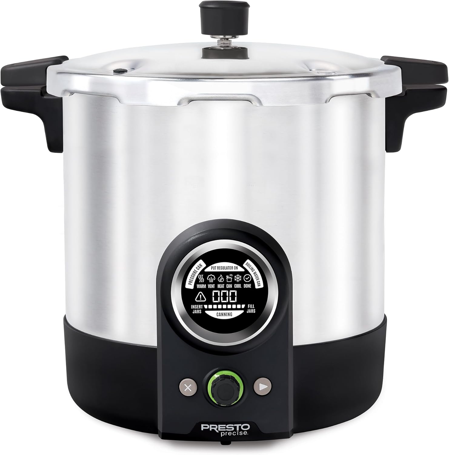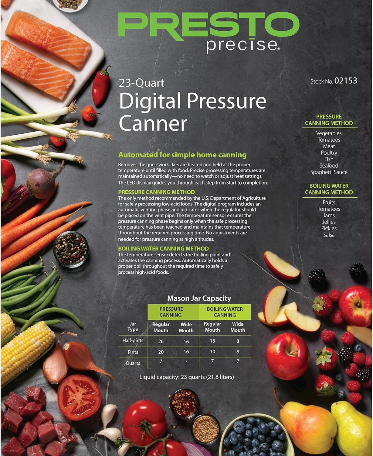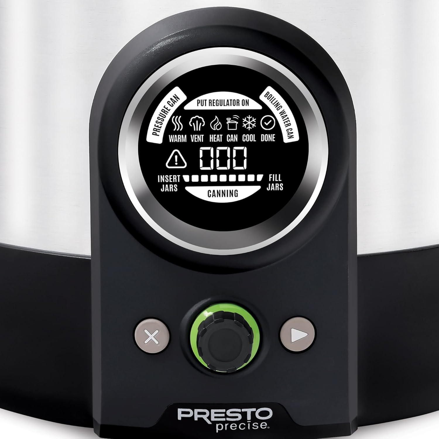The extra-tall Presto Precise® 23-quart Digital Canner gives you the best of both worlds—extra capacity to hold quart jars for both pressure and boiling water canning as well as a larger number of pint and smaller jars for pressure canning. The LED digital display guides you through each step from start to finish, whether you are processing low-aid foods like vegetables, meat, and fish or high-acid foods such as fruits, jams, and salsa. An innovative sensor allows the canner to automatically detect and hold the exact temperature required for safe home canning, with no adjustments necessary, even when pressure canning at high altitudes. With a user-friendly digital interface, the canner allows you to select the canning method and set the processing time, while the built-in timer ensures accurate, reliable results. The canner even preheats your jars and keeps them hot until filled and ready for processing. For boiling water canning, the sensor detects when the water reaches the boiling point and automatically activates the canning process, making it virtually effortless to process high-acid foods. Made from polished heavy-gauge aluminum, this durable hybrid digital canner is built for capacity and performance. It comes with a canning rack, a detailed instruction/recipe book, and an easy-to-reference quickstart guide. You will have the peace of mind knowing that the Presto Precise® Digital Pressure Canner is equipped with ten built-in safety features including a cover locking system and an alert symbol that indicates an incomplete canning process. Whether you are a longtime canner or a beginner, the Presto Precise® Digital Canner simplifies the process and makes it more enjoyable. Regular mason jar capacity: Pressure Canning 26 half-pints, 20 pints, 7 quarts | Boiling Water Canning 13 half-pints, 10 pints, 7 quarts