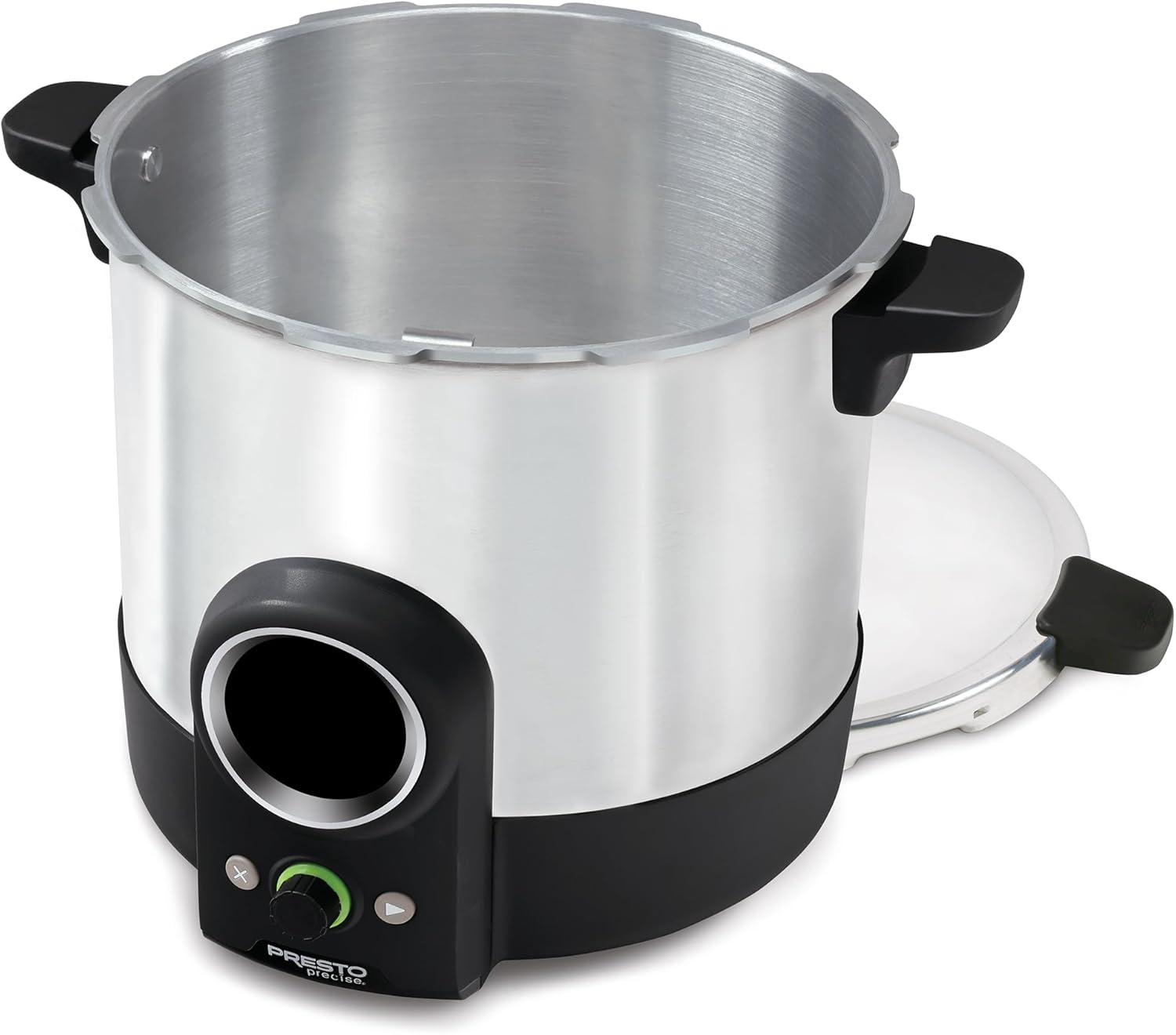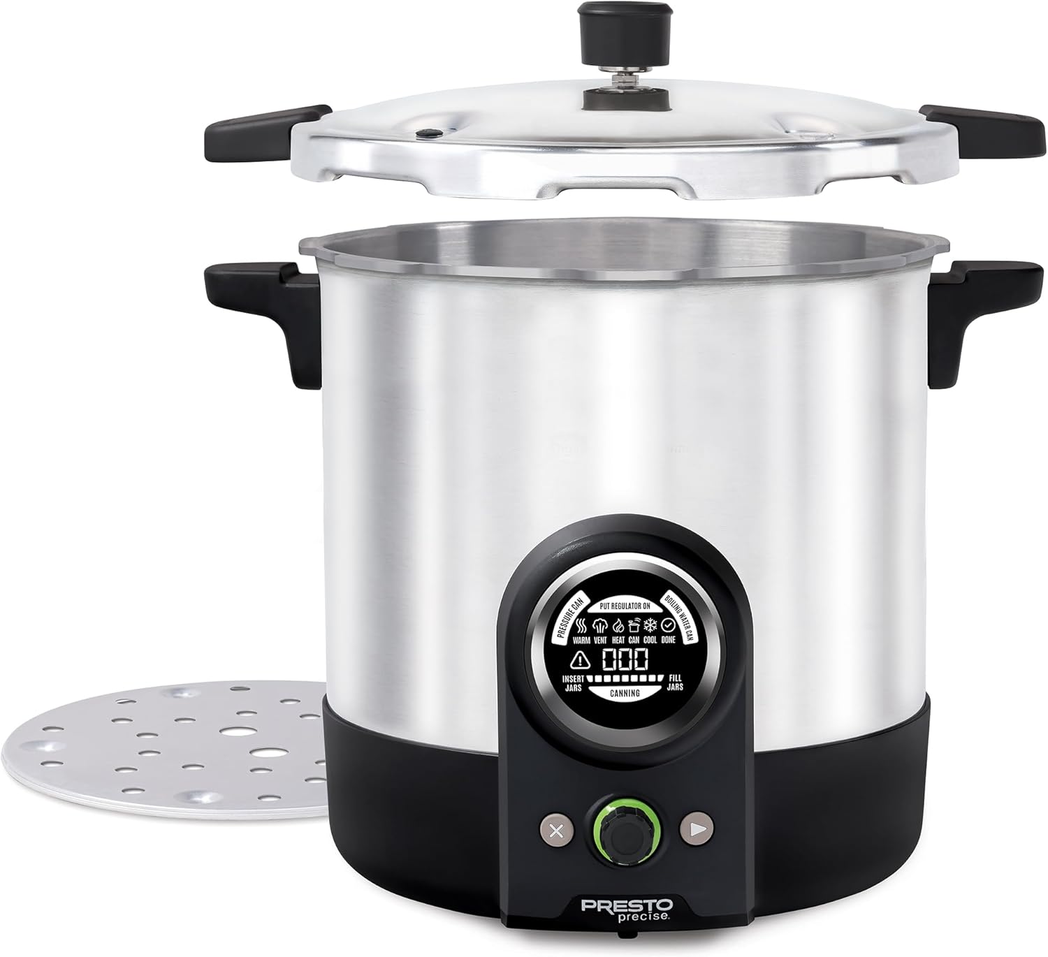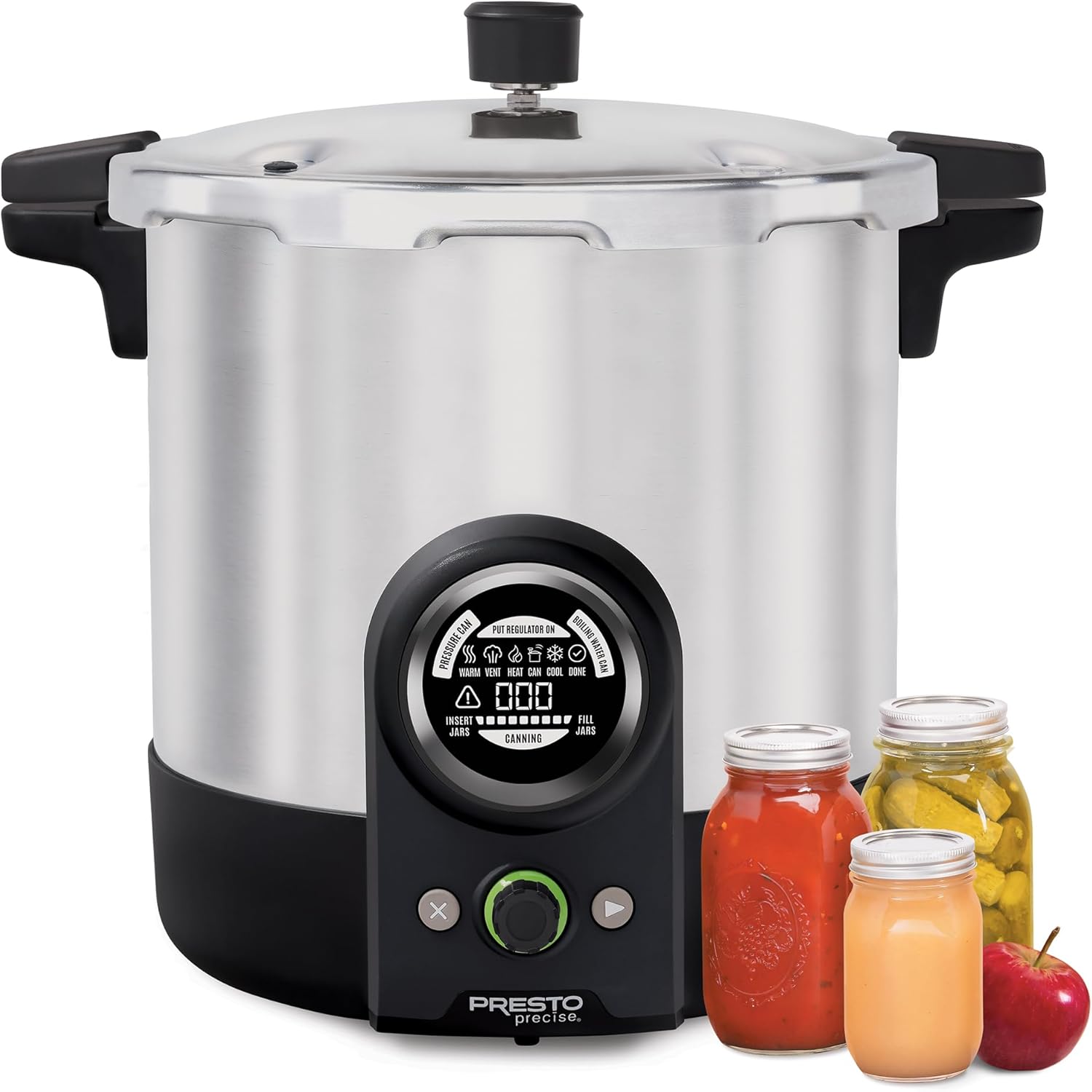 The extra-tall Presto Precise® 23-quart Digital Canner gives you the best of both worlds—extra capacity to hold quart jars for both pressure and boiling water canning as well as a larger number of pint and smaller jars for pressure canning. The LED digital display guides you through each step from start to finish, whether you are processing low-aid foods like vegetables, meat, and fish or high-acid foods such as fruits, jams, and salsa. An innovative sensor allows the canner to automatically detect and hold the exact temperature required for safe home canning, with no adjustments necessary, even when pressure canning at high altitudes. With a user-friendly digital interface, the canner allows you to select the canning method and set the processing time, while the built-in timer ensures accurate, reliable results. The canner even preheats your jars and keeps them hot until filled and ready for processing. For boiling water canning, the sensor detects when the water reaches the boiling point and automatically activates the canning process, making it virtually effortless to process high-acid foods. Made from polished heavy-gauge aluminum, this durable hybrid digital canner is built for capacity and performance. It comes with a canning rack, a detailed instruction/recipe book, and an easy-to-reference quickstart guide. You will have the peace of mind knowing that the Presto Precise® Digital Pressure Canner is equipped with ten built-in safety features including a cover locking system and an alert symbol that indicates an incomplete canning process. Whether you are a longtime canner or a beginner, the Presto Precise® Digital Canner simplifies the process and makes it more enjoyable. Regular mason jar capacity: Pressure Canning 26 half-pints, 20 pints, 7 quarts | Boiling Water Canning 13 half-pints, 10 pints, 7 quarts
