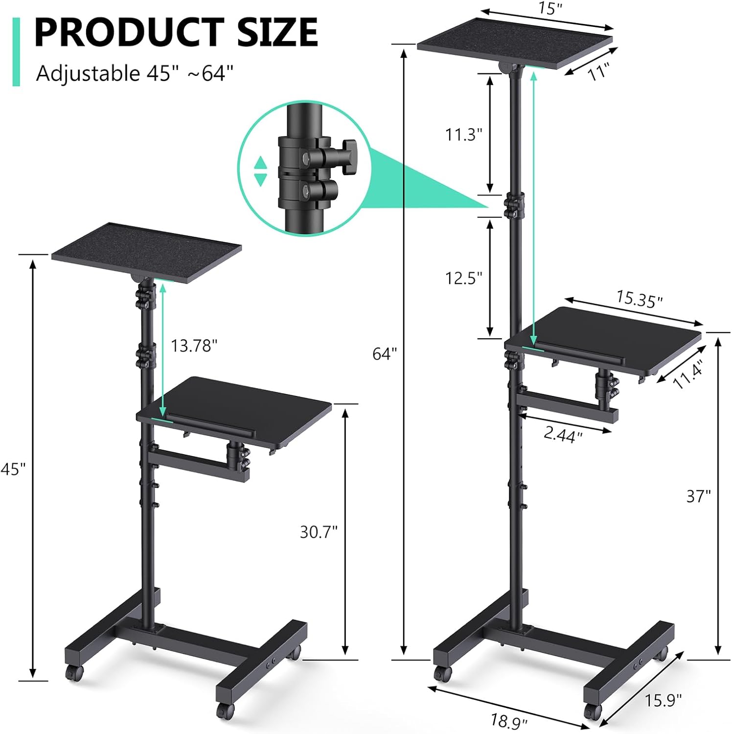 Adjustable Height & Tilt Angles: Offering unparalleled flexibility, the projector stand tripod can be adjusted in height from 45-64 inches, while the bottom tray ranges from 31-35 inches. Both trays can tilt 180°, ensuring optimal viewing angles for any situation, whether for presentations or personal use