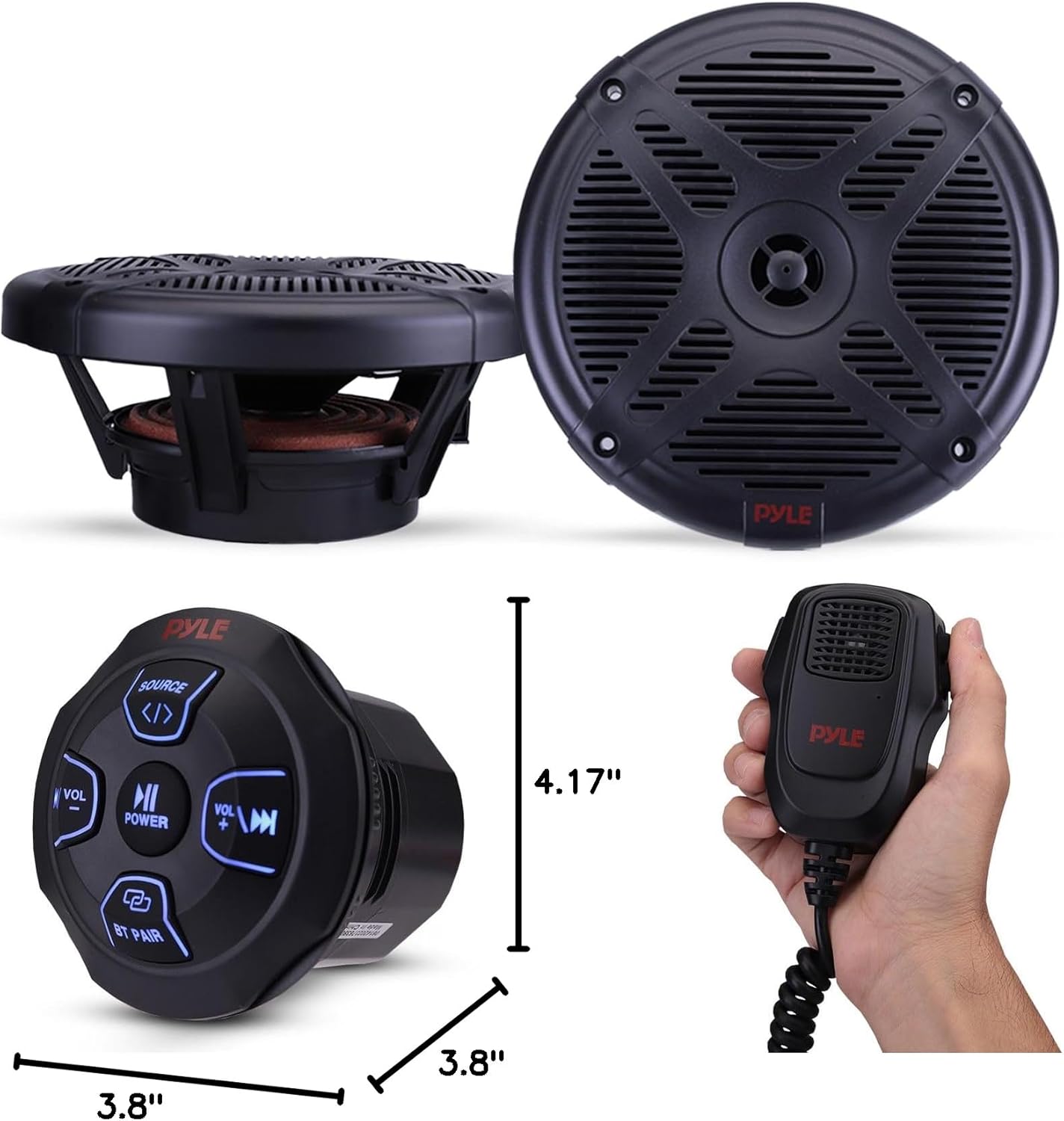 Pyle Marine Bluetooth Receiver Speaker Kit – Waterproof Audio Entertainment System Set w/Dual 6.5″ Boat Speakers, Wireless BT Controller, Compact Handheld Broadcasting Microphone (Black)