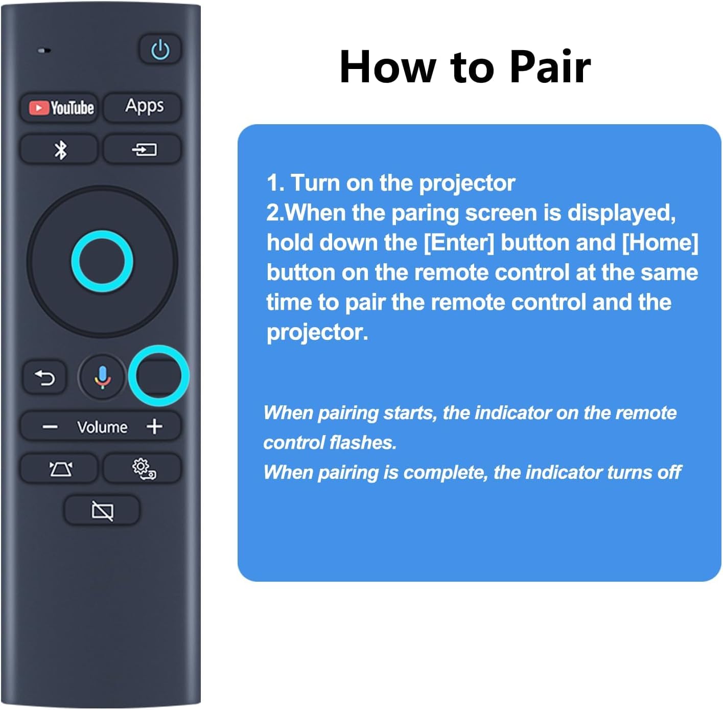 How To Pair: 1)Turn on the projector. 2)When the paring screen is displayed, hold down the [Enter] button and [Home] button on the remote control at the same time to pair the remote control and the projector (When pairing starts, the indicator on the remote control flashes. When pairing is complete, the indicator turns off)