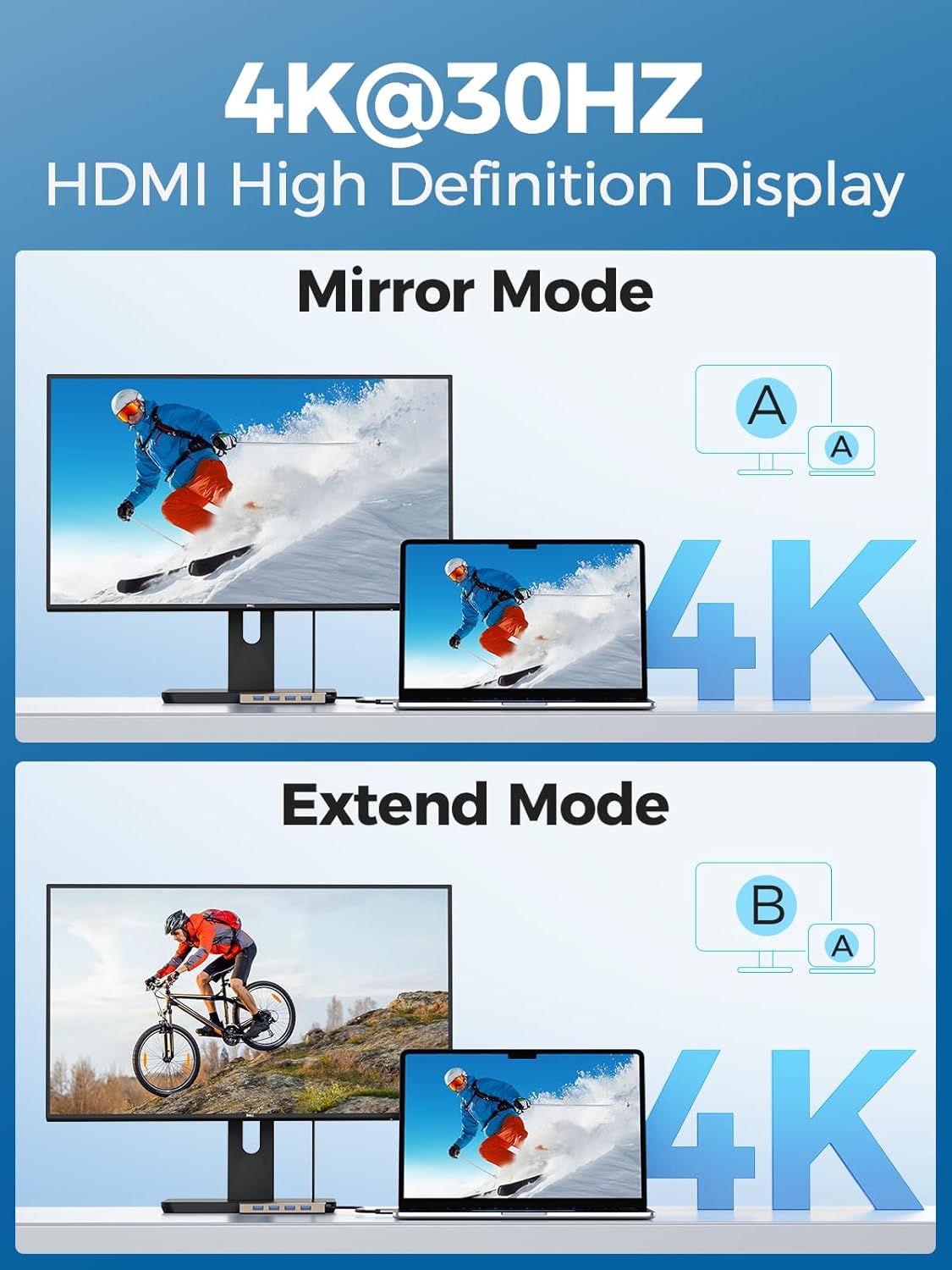 4K High-Definition Output: Just connect the usb c multiport adapter to HDMI port, and you can instantly achieve vivid 4K@30Hz (3840×2160) video and audio transmission, which can be mirrored or expanded. Transfer vivid on-screen 3D effects from your laptop screen to monitors, projectors, HDTVs, and more. USB C hubs give you more workspace and are perfect for home offices.