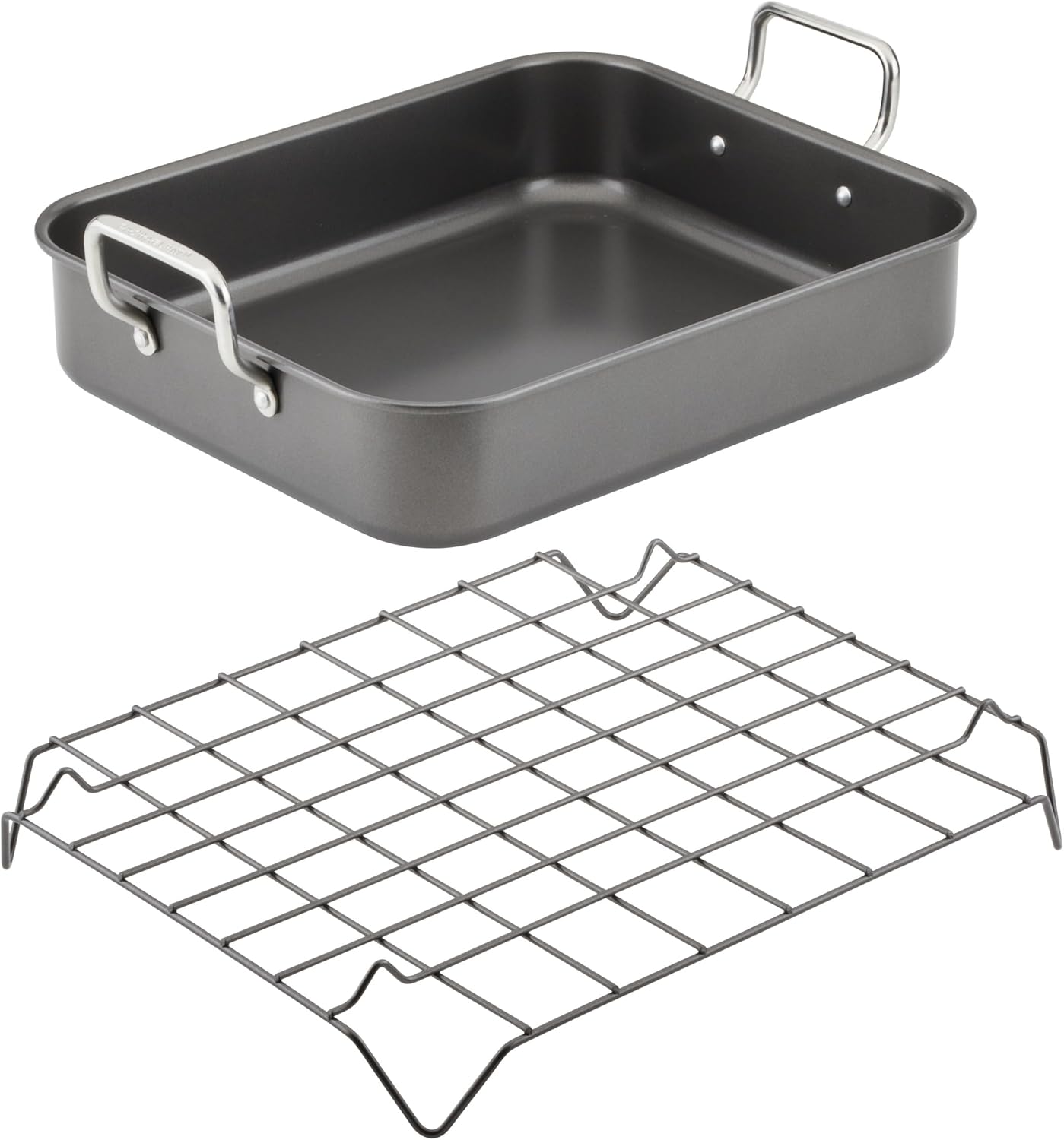 Rachael Ray Bakeware Nonstick Roaster/Roasting Pan with Reversible Rack, 16.5 Inch x 13.5 Inch, Gray