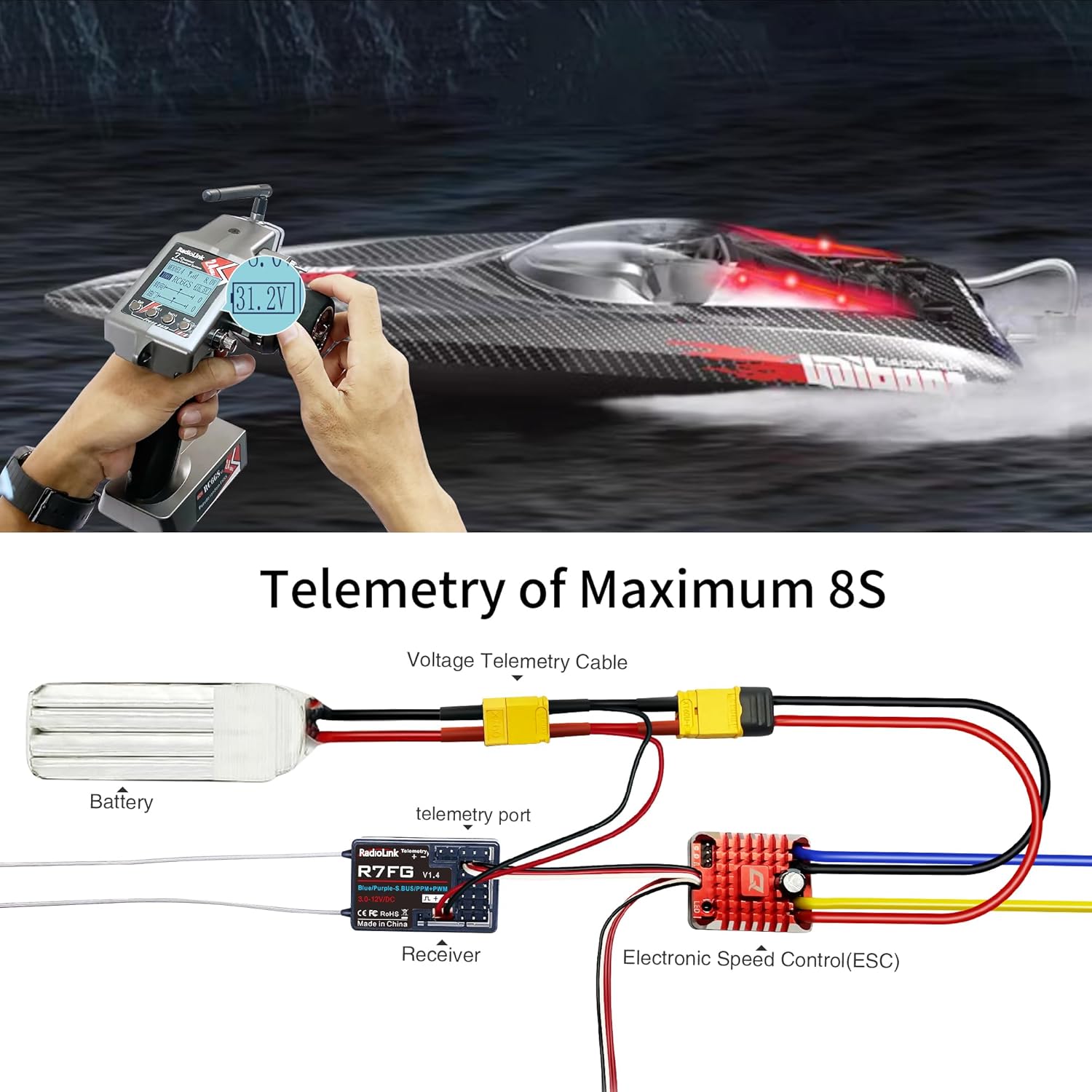 Key Features: With Gyro inside, Telemetry Model Voltage, Receiver Voltage, and RSSI(Received Signal Strength Indication), Water Splash Proof (IPX4), Anti-reverse polarity protect, Control range up to 600 meters(1969 feet) on the ground, low latency response on all 7 channels.