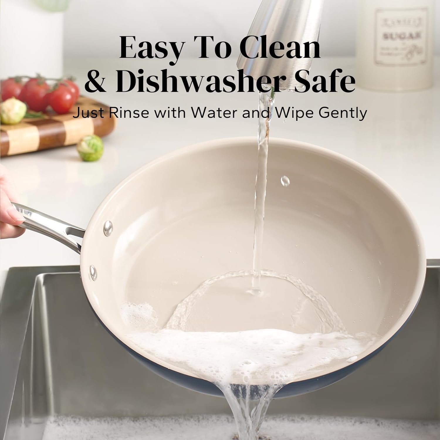COOL & STURDY HANDLE: Crafted from lightweight, precision-pressed stainless steel, this ergonomically designed handle ensures a comfortable grip. Double-riveted for exceptional strength and maneuverability, ceramic saute pan empowers you to seamlessly transition from stovetop to oven, allowing you to achieve that flawless sear, brown toppings, or even bake