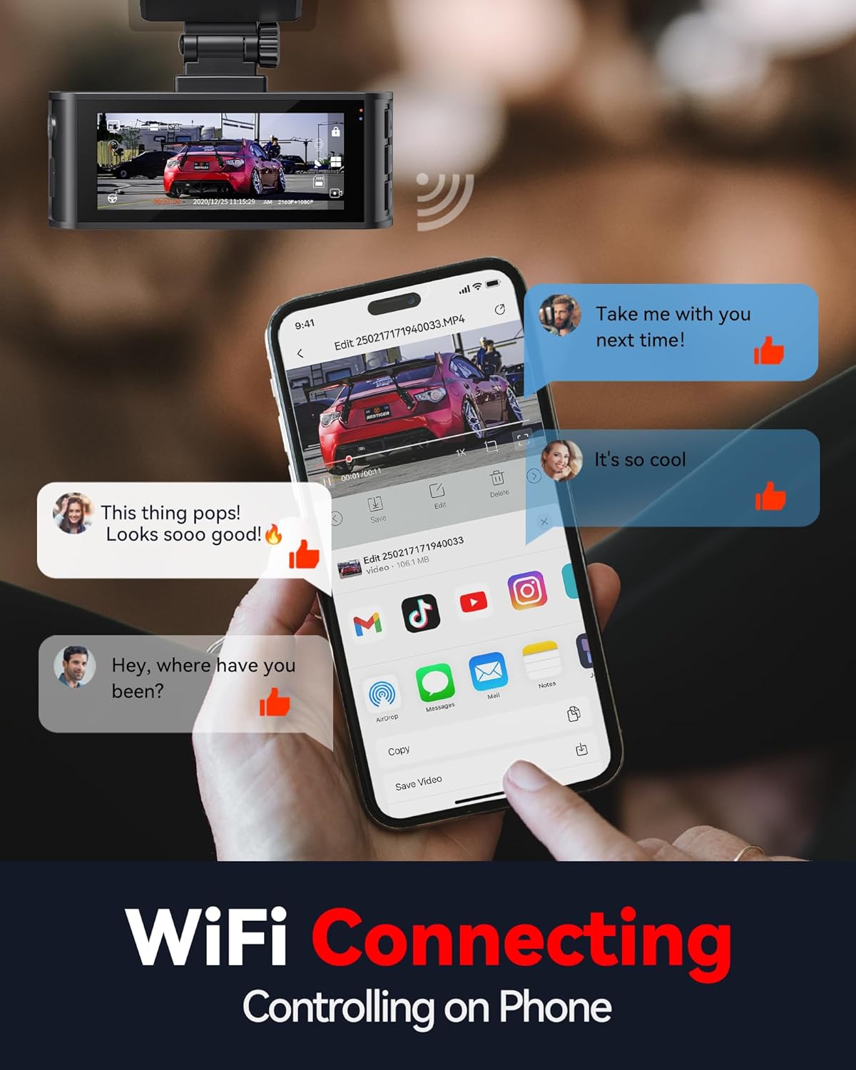 [Built-in GPS & Wi-Fi Connection] The built-in GPS module enables the front and rear dash cam to precisely pinpoint the vehicle’s location, routes and speed in the recordings via the “REDTIGER” app and GPS player on your smart device. Connecting to your mobile devices through F7N dashcam’s built-in Wi-Fi, enjoy wireless data transfer, change settings, easily control the cam, view, download and share the videos.