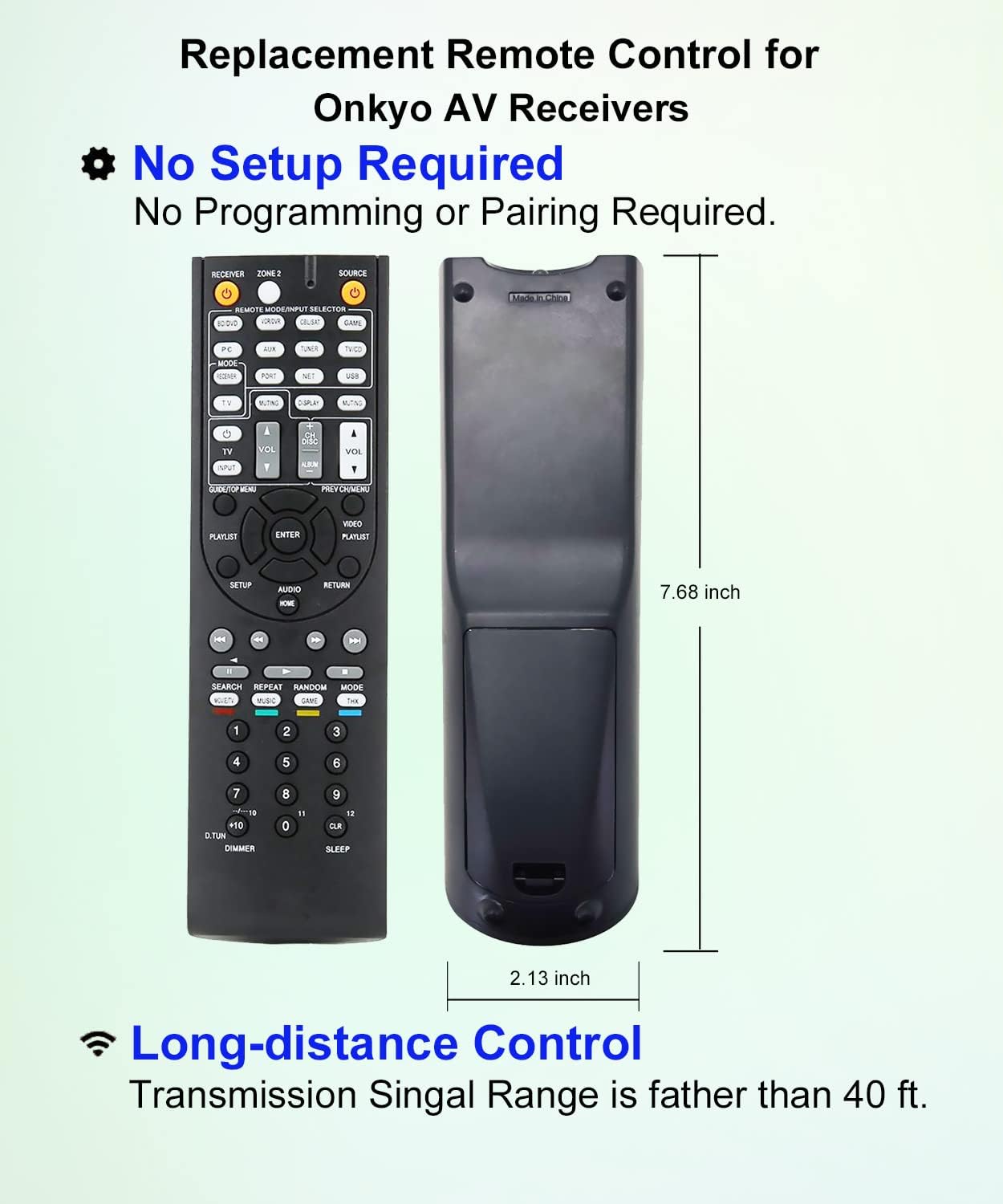 【Product Description】 AV receiver remote control universal for almost all Onkyo home theater audio AV receiver system, replacement for Onkyo av receiver remote control. Some knowing models as shown below, Ctrl+F then enter your model you can find the model highlighted ( If not find, please kindly email us we will find the remote you need for you).