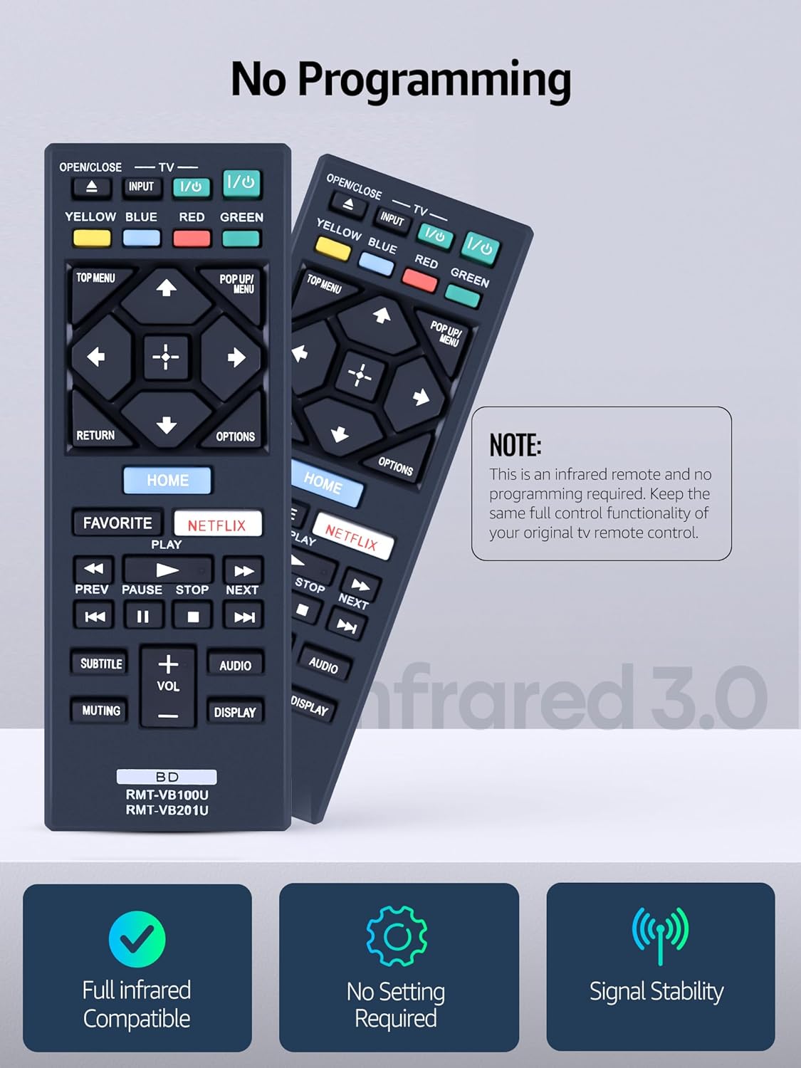 【Compatible For Sony DVD Series Player 】this rmt-vb100u replacement ir remote control for Sony DVD Blu-Ray Disc Player/Sony BDP Series Player/Sony 4K Ultra HD UHD 3D Player/Streaming Blu-Ray Home Theater.