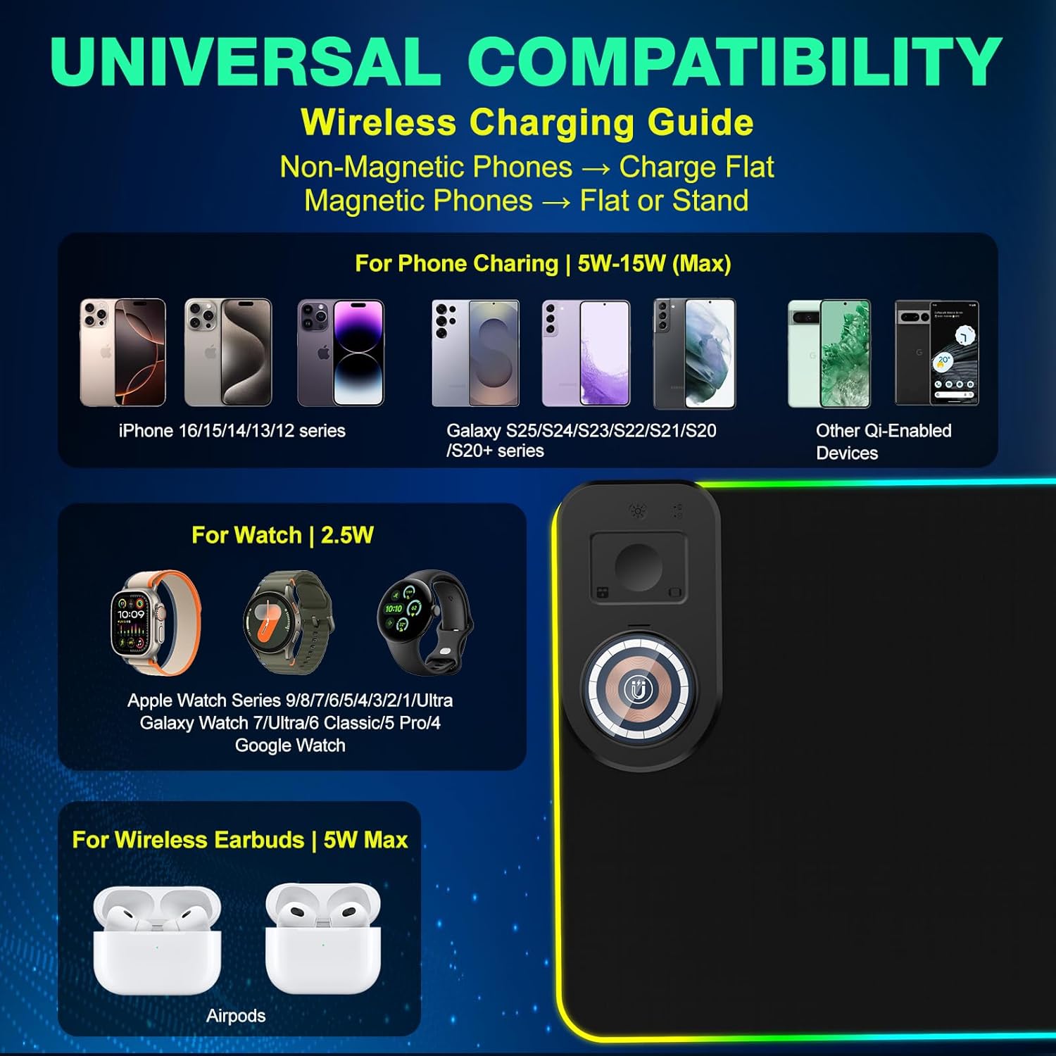 【2-in-1 Wireless Charging: Power Your Phone & Earbuds Simultaneously】Effortlessly charge Qi-enabled phones—including iPhone 16/15/14/13/12 series and Galaxy S22/S21/S20/S20+/S20 Ultra/S10/S9/S8 Note 9/8—together with accessories like AirPods or smartwatches all on one sleek platform. For optimal fast charging, use the included 20W power adapter and USB-C to USB-C cable. This all-in-one mouse pad acts as a sleek desk pad, keeping your gaming battlefield organized and clutter-free
