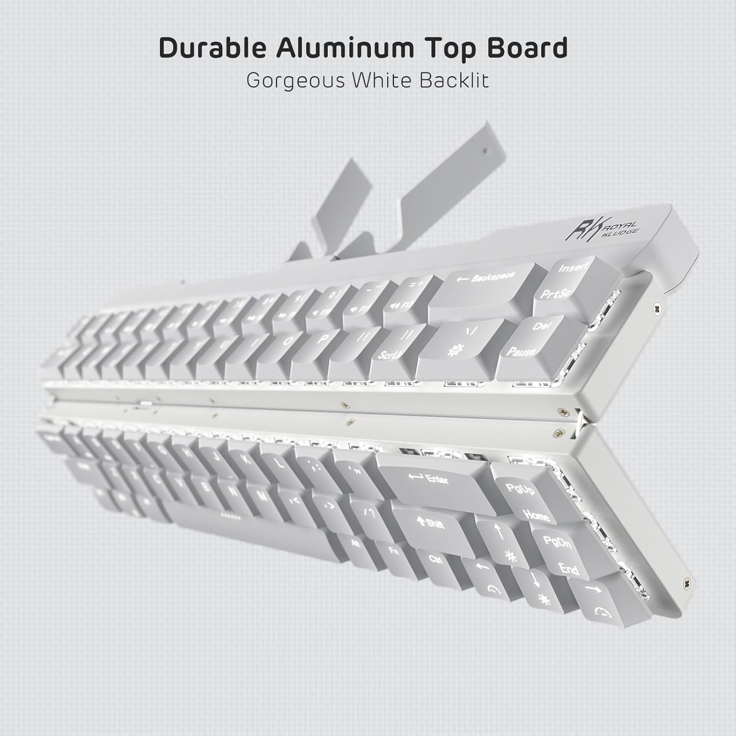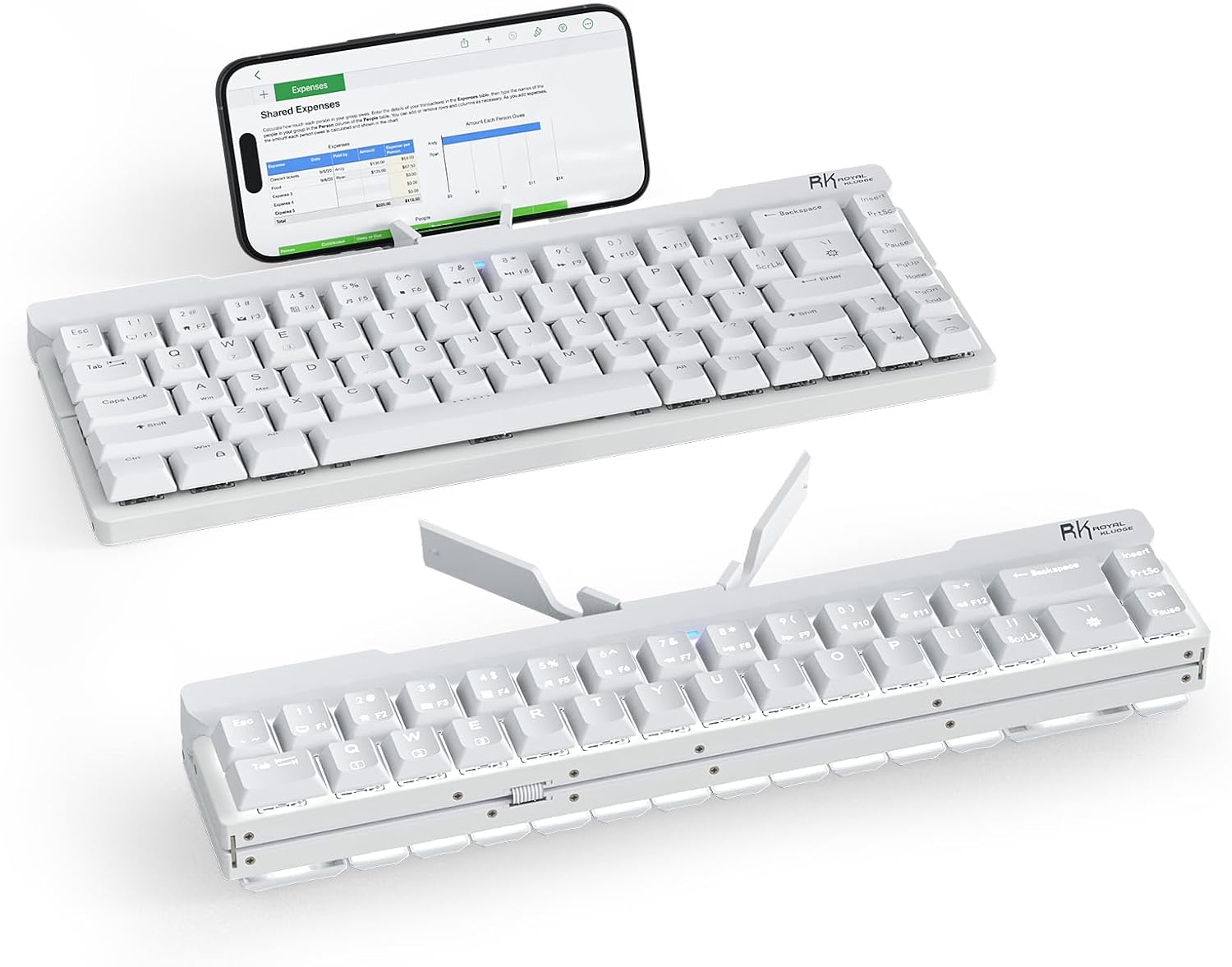 RK ROYAL KLUDGE F68 60% Foldable Low Profile Mechanical Keyboard, Wireless Mechanical Keyboard with Aluminum Body, Built-in Stand Holder, White Backlit, 68 Keys, Quiet Red Switch