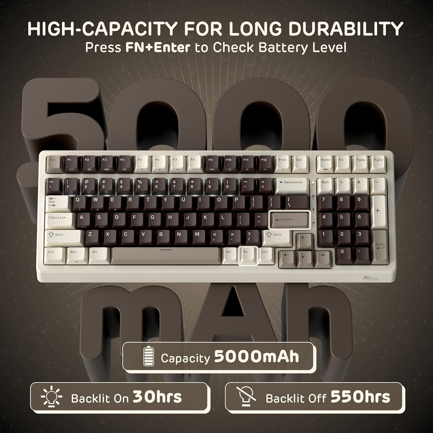 Massive 5000 mAh Battery — Boasting a high-capacity 5000 mAh battery, this 95% keyboard offers up to 550 hours of non-stop use with RGB backlight off and 30 hours with RGB on. Quickly check remaining power via FN+ENTER shortcut and recharge fully within 10 hours.