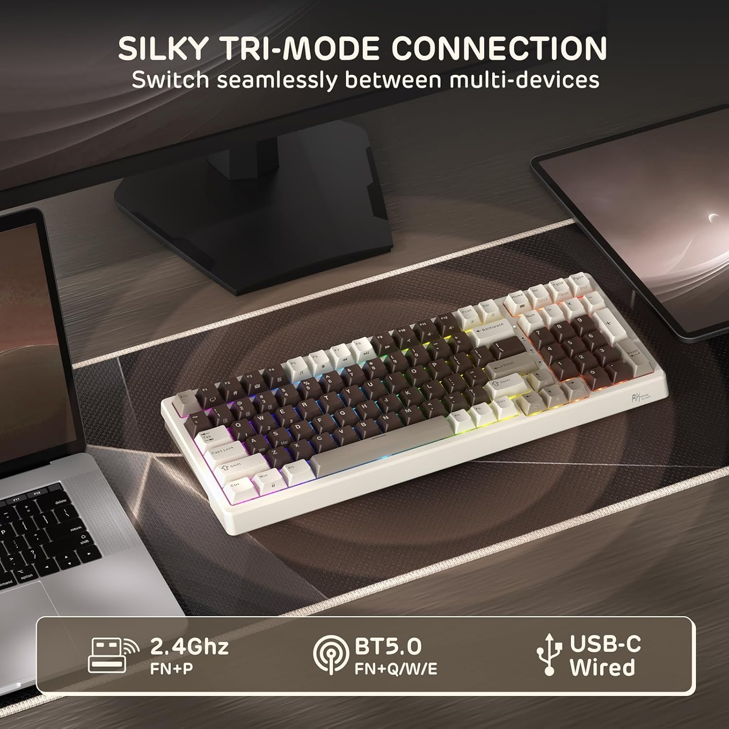 Seamless Tri-Mode Connectivity — Switch effortlessly between 2.4GHz wireless, Bluetooth 5.0, and USB-C wired connections for ultimate versatility. The RK F99 supports multi-device connectivity and features dazzling south-facing RGB lighting for vibrant shine-through effects.