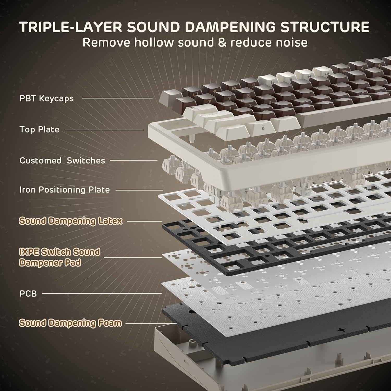 Triple-Layer Sound Dampening — With 3 layers of internal padding, including a thick bottom sound-absorbing foam, an IXPE switch pad, and a latex dampener, this keyboard structure significantly minimizes hollow sounds and cavity noise, delivering a super smooth and satisfying typing experience.