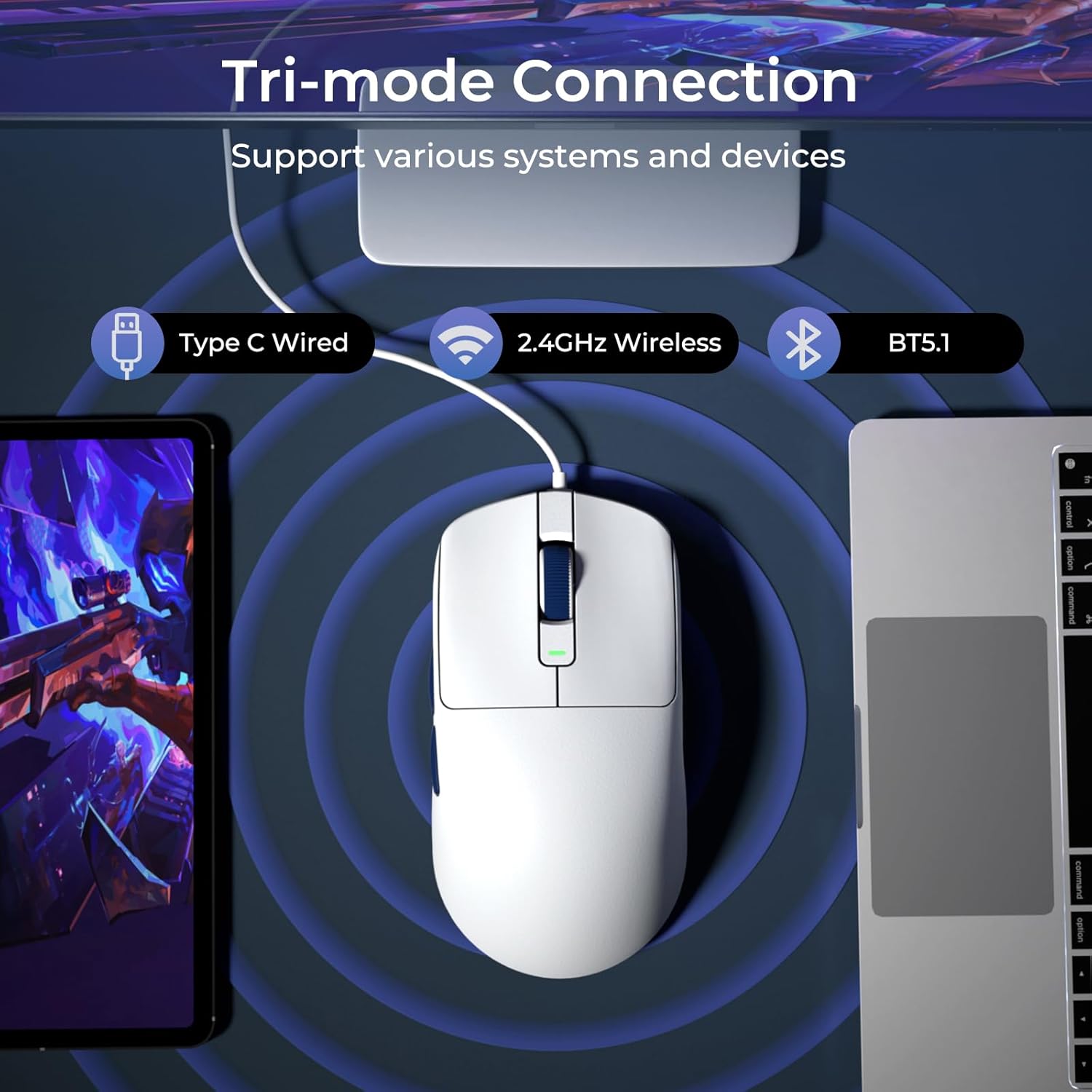Tri-Mode Connectivity — Effortlessly switch between 2.4G wireless, Bluetooth 5.1, and USB-C wired modes with a simple press of the bottom button. Whether you’re gaming, working, or studying, this computer wireless mouse delivers seamless performance to match your needs.