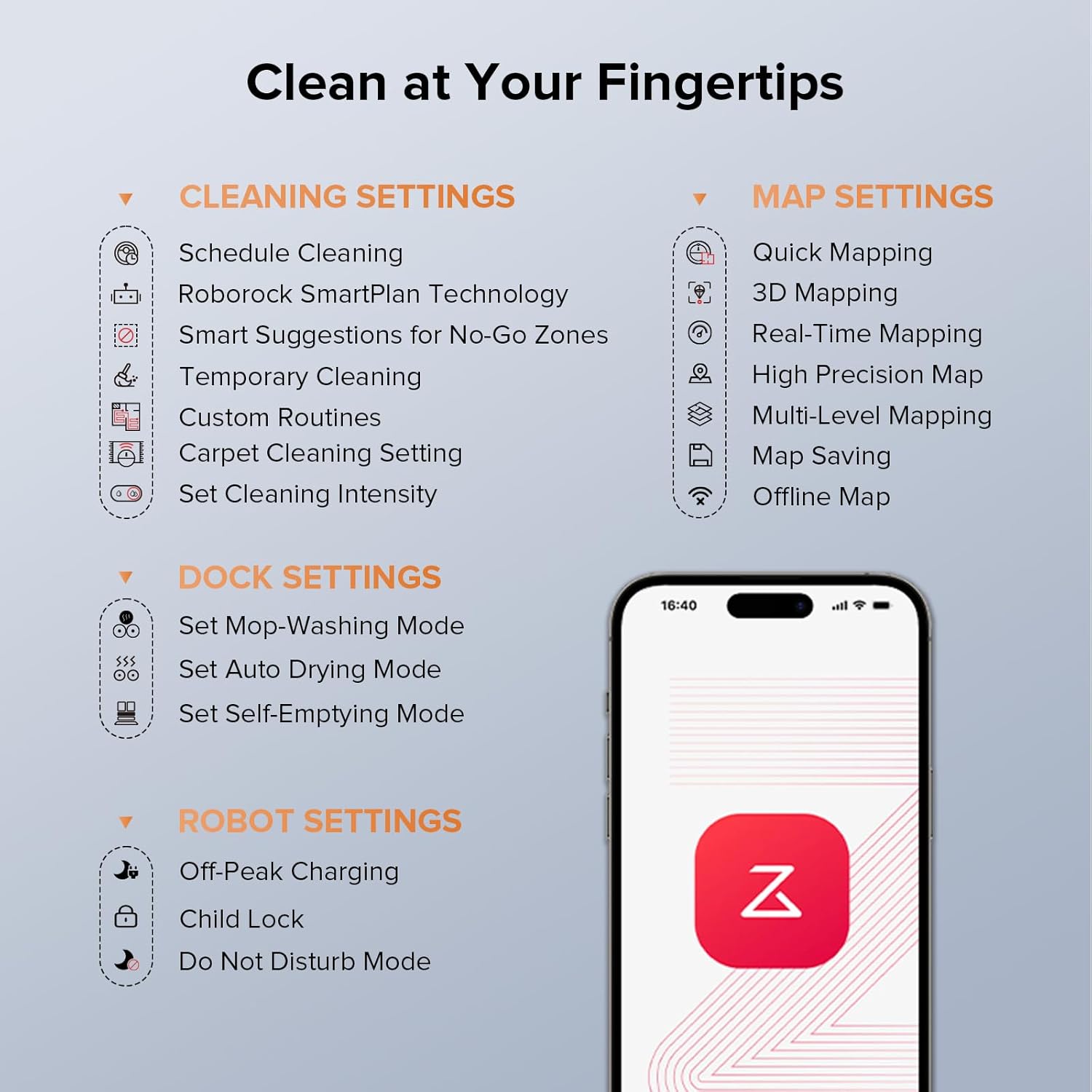 Control at Your Fingertips: Manage all things with the upgraded Roborock app. Advanced AI algorithms ensure smarter, stress-free cleaning. Diverse functions, including routines, map details, washing temperatures, drying duration, and maintenance conditions, are easily managed in the app.