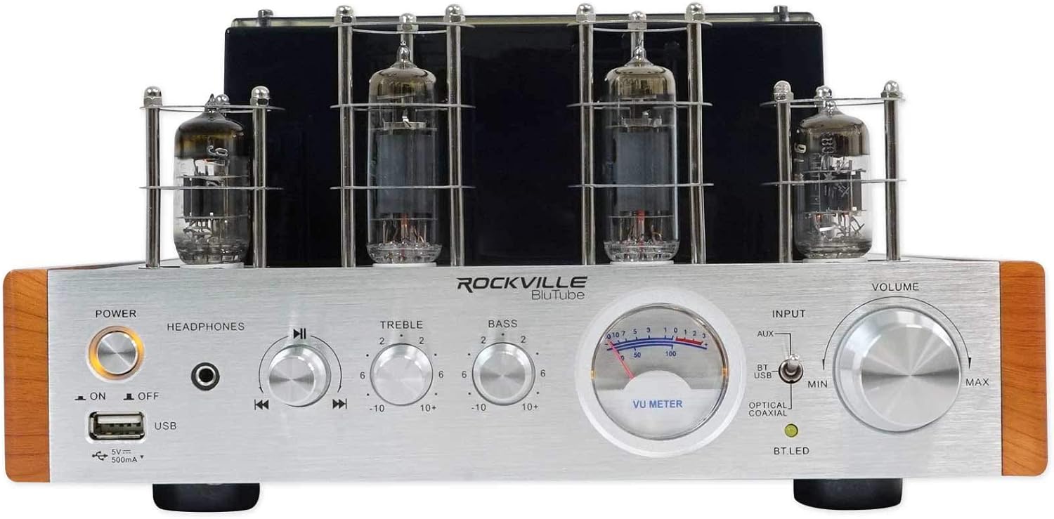 The Rockville BluTube WD 70W Tube Amplifier/Home Stereo Receiver brings audiophile-grade sound to your home with its hybrid tube design, delivering warm, clear audio for music, movies, and gaming. With 25W x 2 RMS at 8 ohms or 35W x 2 RMS at 4 ohms, it produces powerful sound that feels double its rating due to efficient tube amplification. Its 2-tone silver and wood finish complements any decor, making it a stylish addition to living rooms or dedicated audio setups.