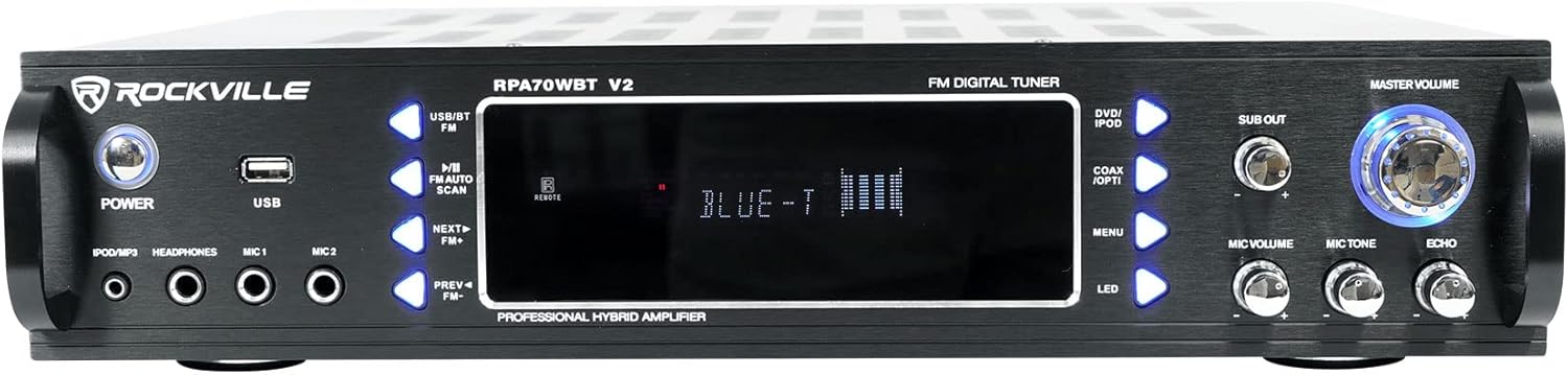 Bluetooth CapableBuilt-in PreamplifierMulticolor LED displayDigital Quartz Synthesized AM / FM tuner w/50 presets & auto scanPreset EQ: Rock, Pop, Classical, JazzRemote control for quick access to all functionsVacuum Fluorescent Digital output display metersSeparate gain controls for pre-amp & subwooferDigital karaoke system2 front microphone inputs w/volume, tone and echo controlsBuilt-in mic mixer with echo controlUSB input for music files from USB thumb drive3.5mm input for iPod / MP3 playerSpectrum analyzer equalizer displayTurbo cooling twin fan system