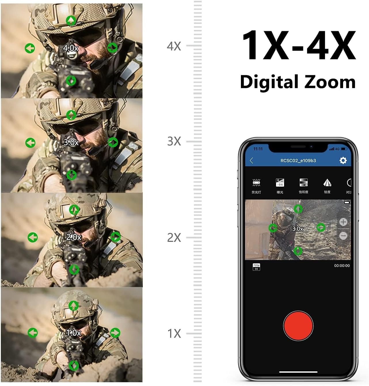 Main Features Ultra HD 4k Resolution Metal Shock-resistant Body IP64 Waterproof 4x Digital Zoom Pre-recording function 2.5 Hours of Continuous Shooting 90° Lens Rotation Customized Crosshairs