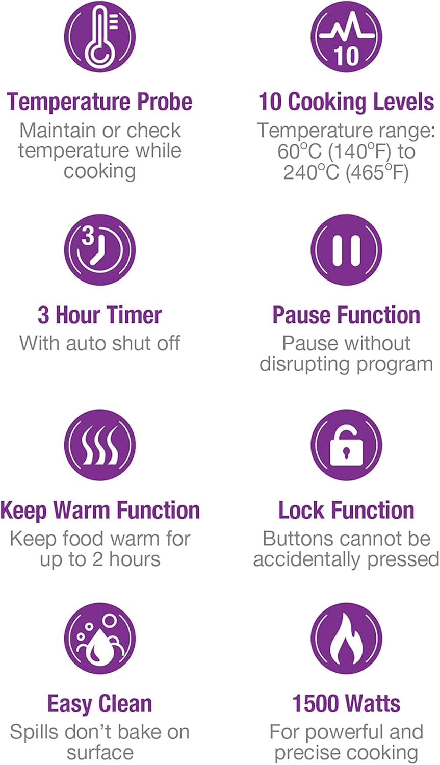 𝗖𝗥𝗬𝗦𝗧𝗔𝗟 𝗚𝗟𝗔𝗦𝗦 𝗦𝗨𝗥𝗙𝗔𝗖𝗘 – The sleek crystal glass top and touch-sensitive controls offer both style and ease of use. Spills won’t bake onto the surface, making clean-up quick and simple for everyday cooking