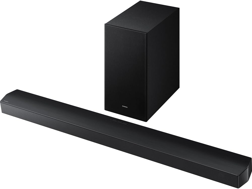 From every line of dialogue to booming sound effects – enjoy realistic, multidirectional sound with 5 channels, including side and center speakers and 1 wireless subwoofer for deep bass. Capture every detail virtually placed above and around you, and experience AI-optimized audio in everything you watch.Have your scenes analyzed in real-time, ensuring sound is optimized so you never miss a moment of dialogue. Plus, pair the soundbar with your Samsung TV to experience powerful, robust audio with Q-Symphony. Put yourself in the heart of the action and get lost in immersive sound with enhanced, built-in side speakers. With five front- and side- firing channels plus a wireless subwoofer, you’ll get well-balanced, multidimensional sound. Key features 5.1ch Sound Put yourself in the heart of the action and get lost in immersive sound with enhanced, built-in side speakers. With five front- and side-firing channels plus a wireless subwoofer, you’ll get well-balanced, multidimensional sound. Q-Symphony Provides a more immersive sound experience with Samsung TV and Soundbar speakers working together for more robust and nuanced sound. With compatible AI TVs2, it enhances audio for even more clarity. Dolby Audio 5.1ch / DTS Virtual:X Get drawn into the action of your favorite movie or show with immersive sound that virtually surrounds you. Dolby Audio 5.1 Ch delivers clear dialogue and precise sound, while DTS Virtual:X provides a 3D audio experience, so you can hear sound around you without the need for rear speakers. Adaptive Sound Get the optimal listening experience for each scene. The soundbar recognizes the type of content you’re watching and automatically adapts audio settings to produce clear voices and detailed sounds. Voice Enhance Hear voices more clealy with automatically amplified dialogue — allowing it to stand out so you don’t miss a word, no matter what you’re watching. Game Mode Optimizes your gaming experience with multi-directional sound that moves with the onscreen action while filtering out distracting sounds with cross-talk noise cancellation. Night mode Don’t want to bother your loved ones? Night Mode lowers the volume and minimizes bass so you can watch TV at any hour without waking up the entire house or your neighbors. Wireless Surround Sound Compatible The perfect add-on to your soundbar for true surround sound HDMI ARC Seamlessly connects and controls the soundbar through your TV using a single cable. Bluetooth Multi Connection Connect up to two devices to your soundbar, like your smartphone and computer, via Bluetooth and switch between them seamlessly. Play your favorite music from either device without disconnecting.