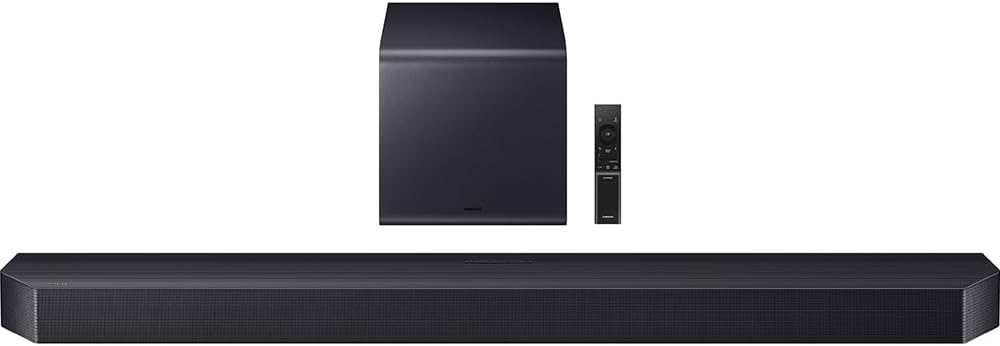Feel the pulse of every scene with immersive, three-dimensional sound that is perfectly calibrated for your space. Designed to deliver sound from every angle, this soundbar features 7 front channels, 1 subwoofer, and 2 up-firing channels, bringing theaterquality audio to your living room. With a wireless surround system that minimizes cable clutter, your home entertainment is about to get a serious upgrade. Features True 7.1.2 Ch Full Surround Be transported out of your living room and placed in the middle of the action with room-filling, exceptional surround sound. Featuring 7 front and 2 up-firing channels, plus a dual 8-inch wireless subwoofer for powerful bass, sound comes from every angle and no detail is ever missed. Hear every whisper, explosion and musical note as if you were right there in the scene. Wireless Dolby Atmos Surround yourself in legendary Dolby Atmos 3D sound — with or without an HDMI cable. The objectbased spatial audio lets you hear every distinct sound from above and around you. Whether it’s the sound of helicopters flying in the sky, cars whizzing by, or an orchestra in a concert hall washing over you, feel fully immersed in your content just like in the movies. Q-Symphony Provides a more immersive sound experience with Samsung TV and Soundbar speakers working together for more robust and nuanced sound. With compatible AI TVs, it separates voices and background sounds from the original audio input and remasters audio objects to deliver optimal surround sound. SpaceFit Sound Pro Plus Enjoy stunning sound automatically tuned and calibrated to your room using sensors embedded into the soundbar. The soundbar automatically adjusts sound settings for clear sound and immersion regardless of your room’s layout or where the soundbar, subwoofer, and rear speakers are placed. With heightened clarity and immersive audio, enjoy the most ideal sound in any space Smart Integration Connect your devices and control everything with our soundbar that integrates your favorite voice assistants and smart services, like Alexa built-in, Googlecast, Airplay 2 and more. Active Voice Amplifier (AVA) Pro Analyzes the background noise in your room and in the content you’re watching and automatically enhances voices in the scene, so dialogue can be heard clearly. Skip the rewind and never miss a word. Subwoofer With Dynamic Bass Control Say goodbye to distracting vibrations and rattles. Get powerful bass enhanced with AIdriven control to reduce distortion caused by subwoofer vibrations for sound that’s true to the original audio – all in a compact subwoofer that blends into your space Game Mode Pro Dynamic, auto-optimized 3D sound for gaming with powerful up-firing speakers and strong woofers. Plus, the soundbar automatically activates Game mode when connected to a compatible TV. Whether you’re exploring new worlds in an Adventure game or blasting enemies in a first person shooter, it automatically optimizes sound for maximum immersion Wireless TV Connection Connect your soundbar to your Samsung TV via Wi-Fi or Bluetooth in just a few simple steps — without needing messy cables — audio and video sync perfectly for a fully immersive viewing experience Adaptive Sound Get the optimal listening experience for each scene. The soundbar intelligently recognizes the type of content you’re watching based on real-time scene analysis and automatically adapts audio settings to produce clear voices and detailed sounds