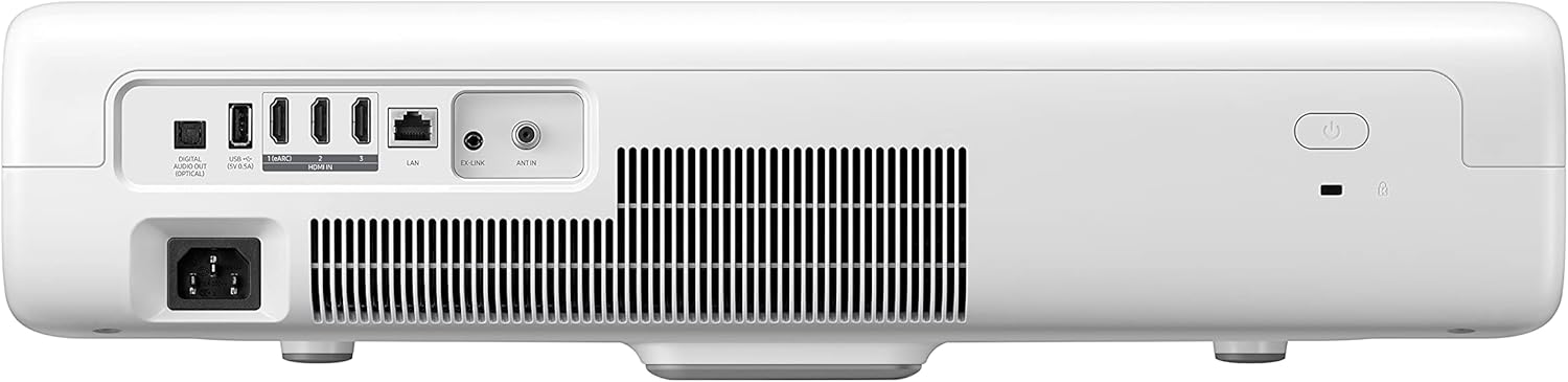 Samsung SP-LSP9T 130″ 4K Laser Short-Throw Projector – 4K UHD Ultra-Bright Triple Laser – Ultra-Short Throw – Compact Minimal Design – HDR10Plus – UHD Processor – Pure Color – Game Enhancer – 2,000,000:1 Contrast – 2800 ANSI Lumens – Tizen – Universal Guide – Multiple Voice Assistants – TV Plus – Samsung OneRemote – Tap View – 3 HDMI – USB – Ethernet – WiFi – Bluetooth – RS232c (Ex-Link) – Optical – TV Tuner – RF – Dolby Digital Plus – 40W 4..2 Channel Speakers – Samsung Acoustic Beam – Filmmaker Mode – Mirror/Casting – (Screen Recommended, But Sold Separately) – (21.70″W x 14.40″D x 5.60″H) – (White)