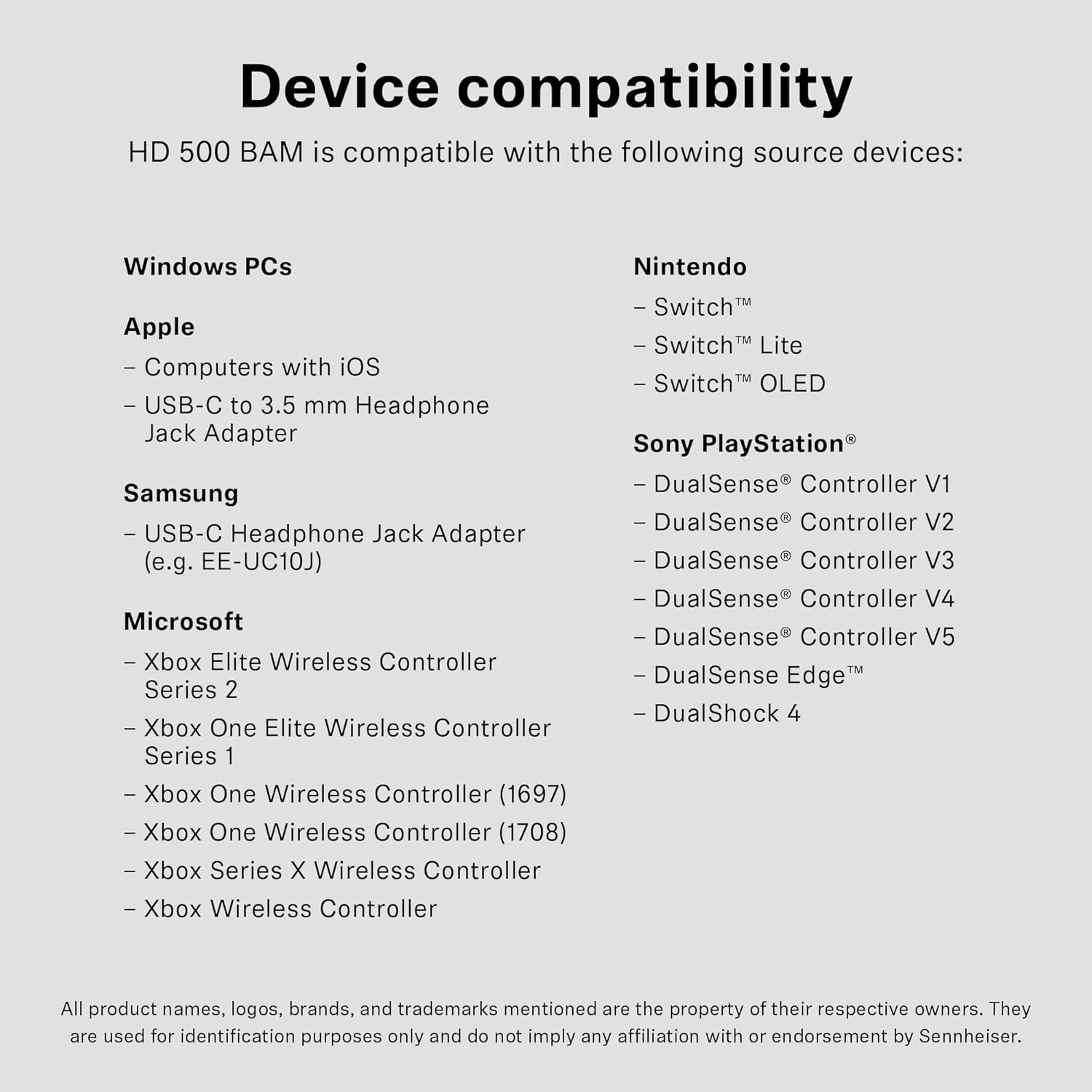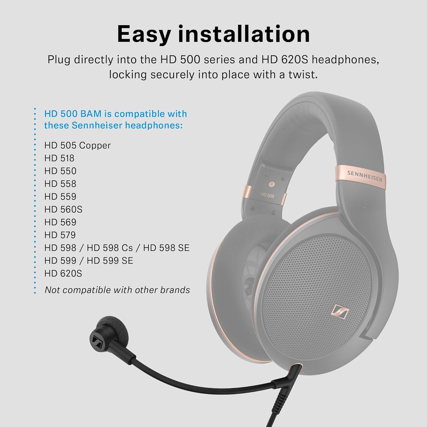 The Sennheiser headphones HD 505 Copper, HD 550, HD 559, HD 560S, HD 569, HD 579, HD 599, HD 599 SE, and HD 620S are all compatible with the HD 500 BAM. Not compatible with other brands.