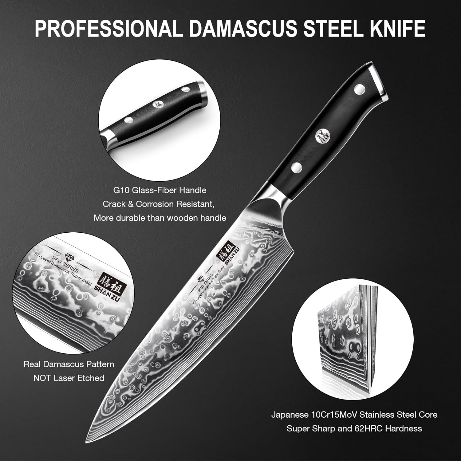 Japanese Steel Knife Core, Super Sharp: SHAN ZU chef’s knife core is made of 10Cr15Mov Damascus Japanese steel that has high hardness(62 HRC), rust-proof, and wear-resistant features; with advanced forging technique, you will get a super sharp kitchen knife