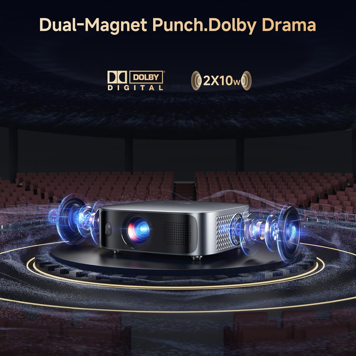 Cinematic Sound with Dolby Audio: The GC355 movie projector delivers immersive, theater-quality audio with Dolby Audio and dual 10W full-range drivers. Even in small rooms, it fills the space with powerful, rich sound — deep bass, crisp highs, and lifelike detail, from drum hits to metallic echoes and string harmonics. Perfect for movies, gaming, or music, it rivals high-end home theater systems. Use built-in Bluetooth to connect external speakers or turn the projector with wifi and Bluetooth into a standalone Bluetooth speaker for parties or outdoor fun. With instant screen mirroring, stream games or apps from your phone to the big screen.