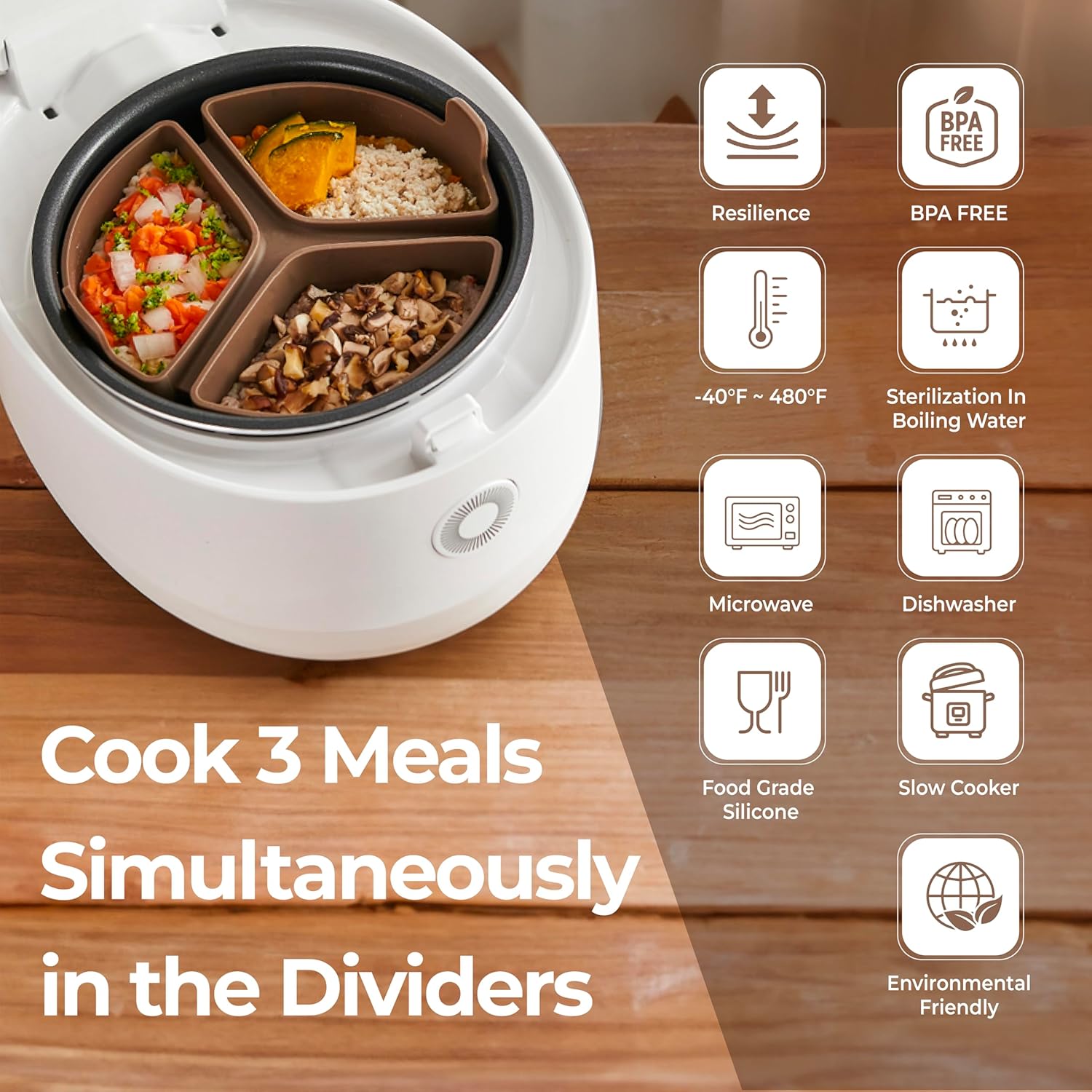 Stylish & Space-Saving: With an elegant taupe brown finish, the slow cooker divider liner fits over 3 cups (uncooked) and blends seamlessly into any kitchen, while keeping mealtime effortlessly organized