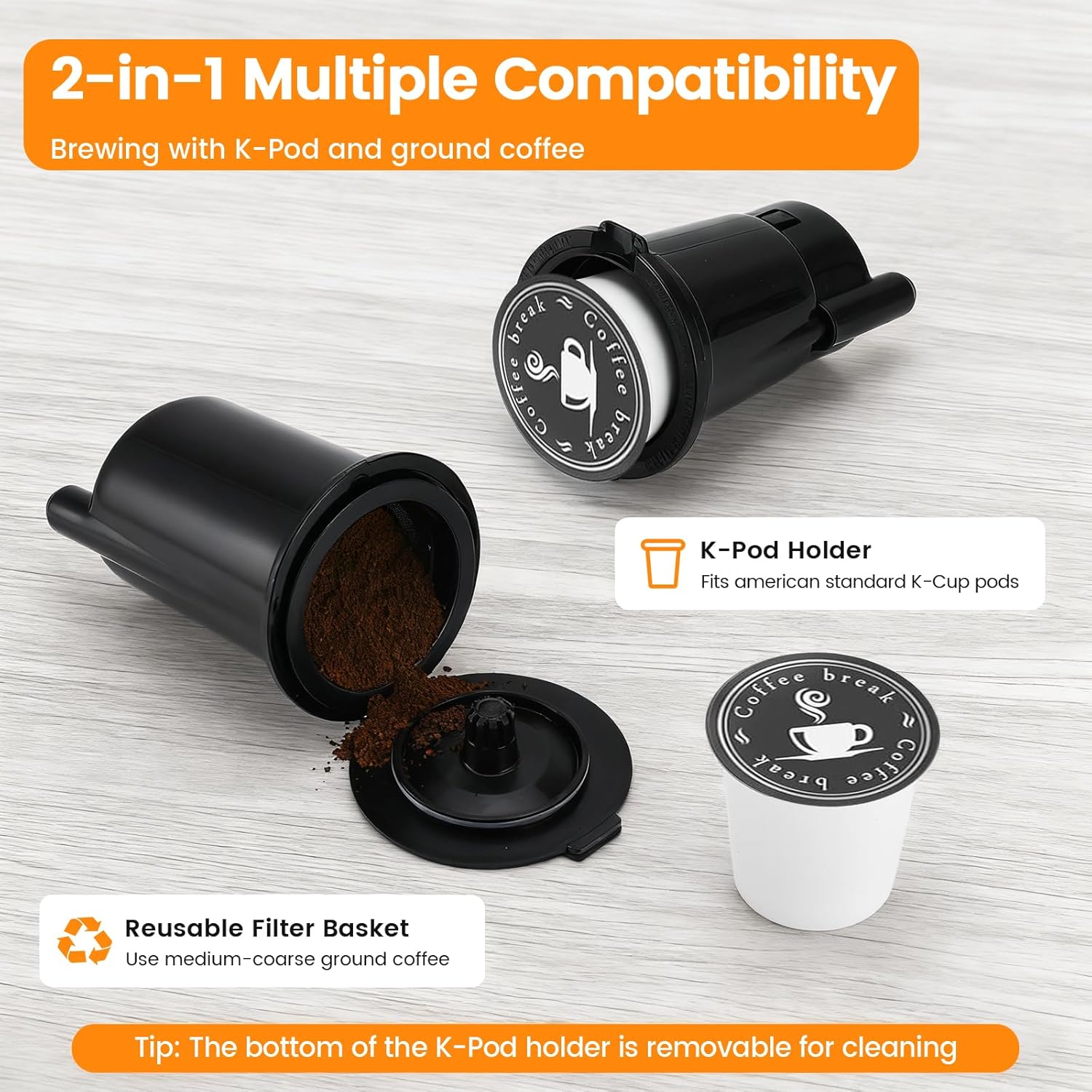 Dual Brewing Flexibility: Enjoy the best of both worlds with this coffee maker that seamlessly works with K-Cup pods and ground coffee. Perfect for quick single serve convenience or a richer, customizable brew