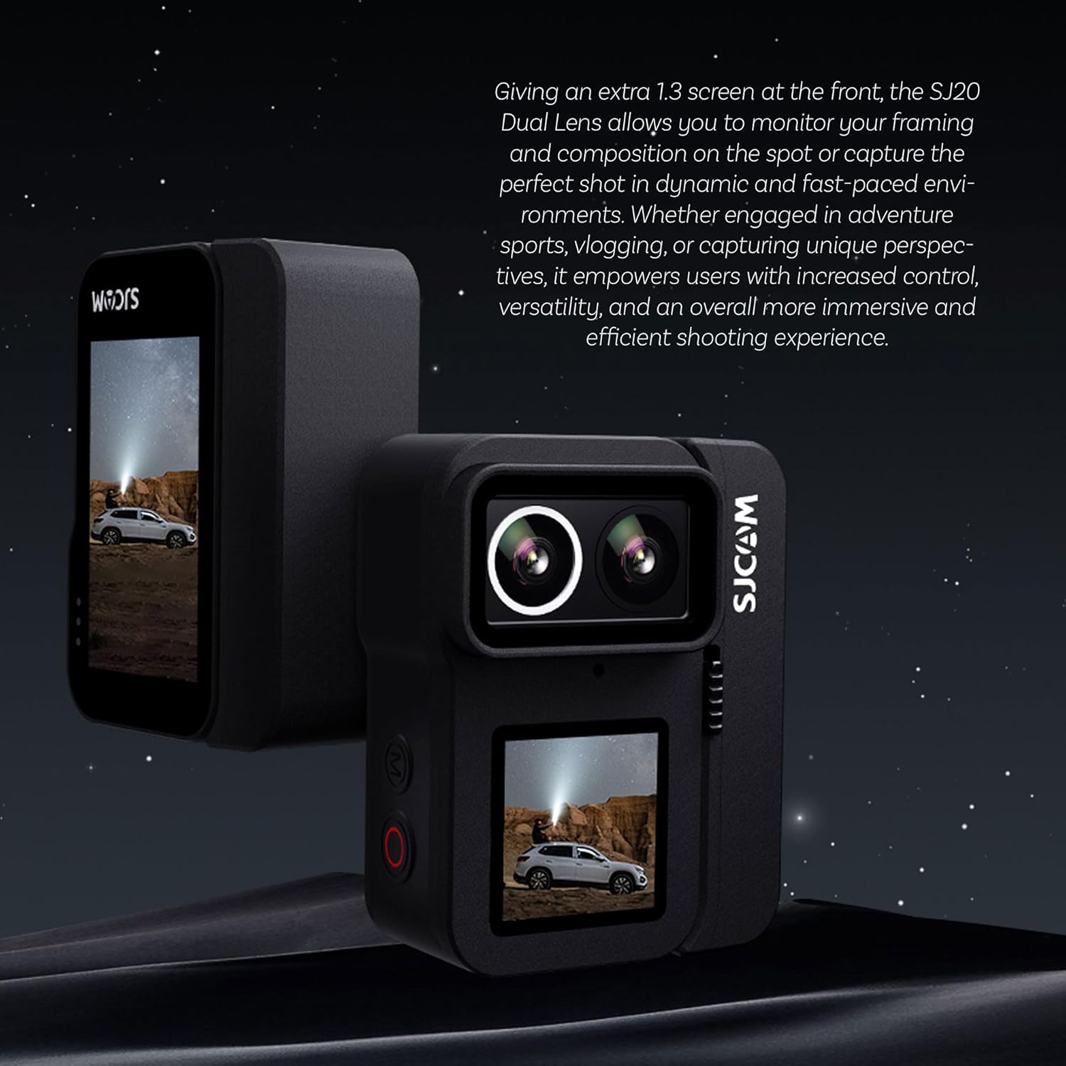The SJCAM SJ20 sets a new standard in action camera versatility, featuring a dual-lens system designed to capture perfect footage in any lighting condition—day or night. With its two distinct lenses, the SJ20 intelligently switches between them to ensure bright, crisp daytime shots and dramatically improved low-light video when shooting in darker environments. Whether you’re hiking under the sun or exploring city streets at night, your content stays vivid and sharp. Shoot in stunning 4K Ultra HD resolution at up to 30fps, supported by advanced 6-axis gyro stabilization for buttery-smooth footage even when you’re on the move. Say goodbye to shaky clips—whether you’re running, biking, or skiing, the SJ20 keeps your videos stable and professional-looking. The SJ20 includes a 2.29″ rear touchscreen for intuitive control and live preview, paired with a side info display for quick access to essential settings. This design saves time and power, especially when you’re checking your mode, battery life, or storage status on the go. With its rugged, IPX8 waterproof body (with included case) and dual battery system offering up to 5 hours of recording time, the SJ20 is a travel-ready powerhouse. Add in features like slow motion, time-lapse, burst mode, Wi-Fi connectivity, and USB-C charging, and you have a truly all-terrain action camera built for creators who never stop exploring.