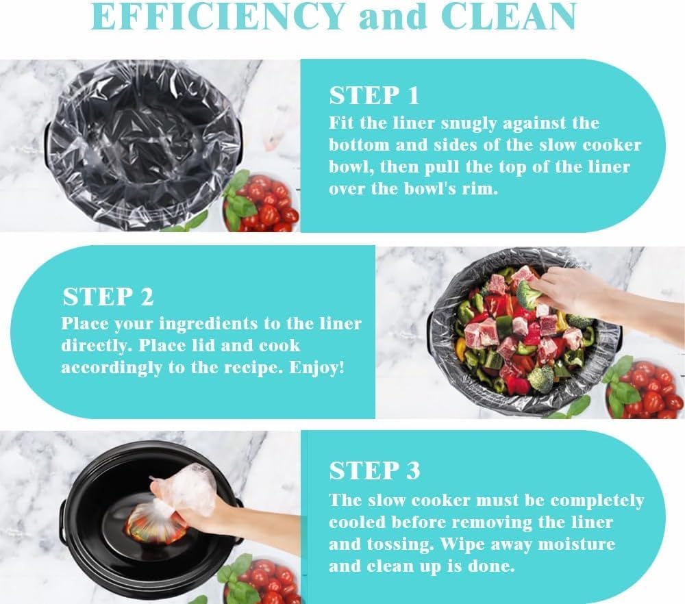 Durable and Convenient : These bags make cleaning up the slow cooker a breeze! They can fit in several different sizes of slow cookers from the original size to the 3 quart oval type. You simply place one in the slow cooker and put your ingredients in turn it on and let it cook.Use our slow cooker liners to cook any food you like, include chicken, fish, soup, dessert and stew.