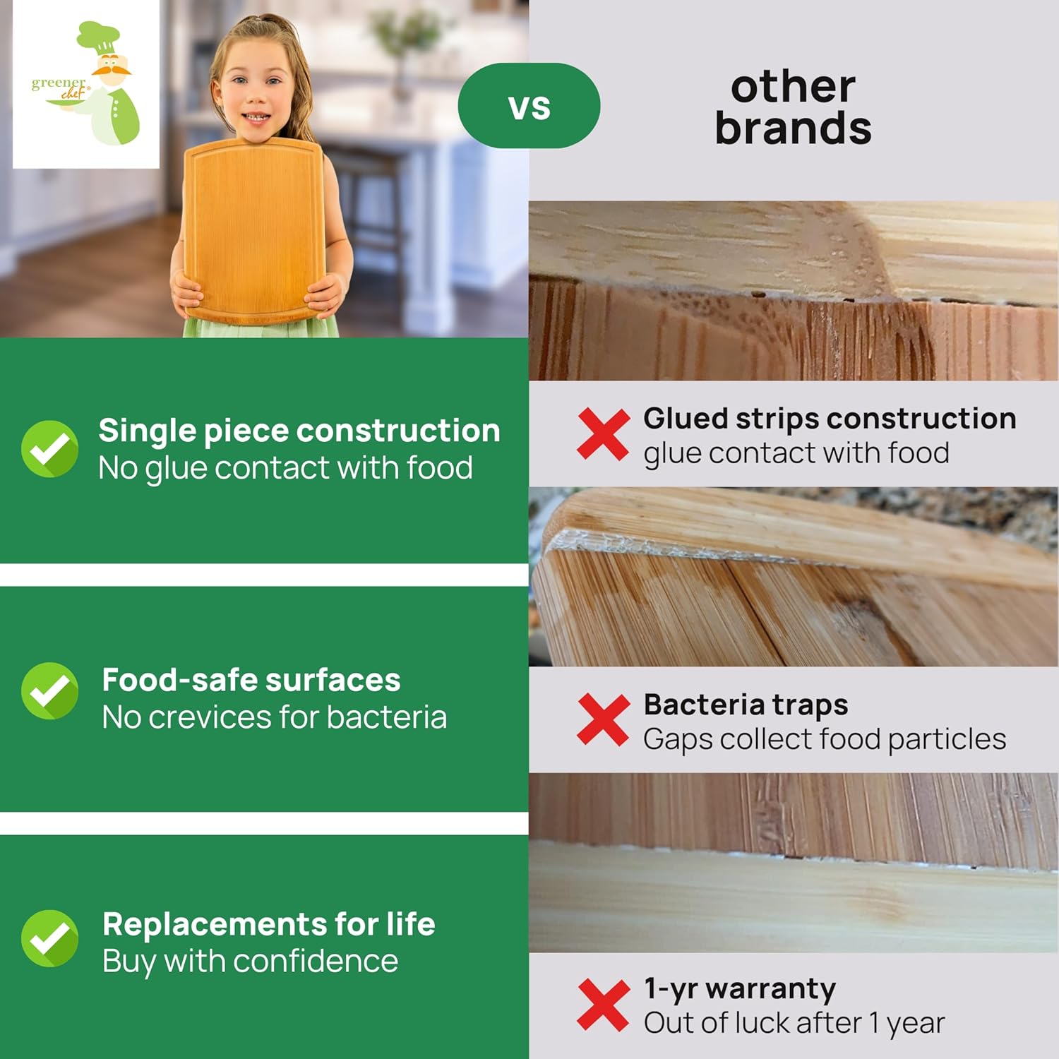 PATENT PENDING GLUE-FREE SURFACE – Crafted from a single rolled sheet of bamboo, our non toxic cutting boards contain no adhesives or chemicals on food-contact surfaces—ensuring safer, cleaner meal prep for your whole family.