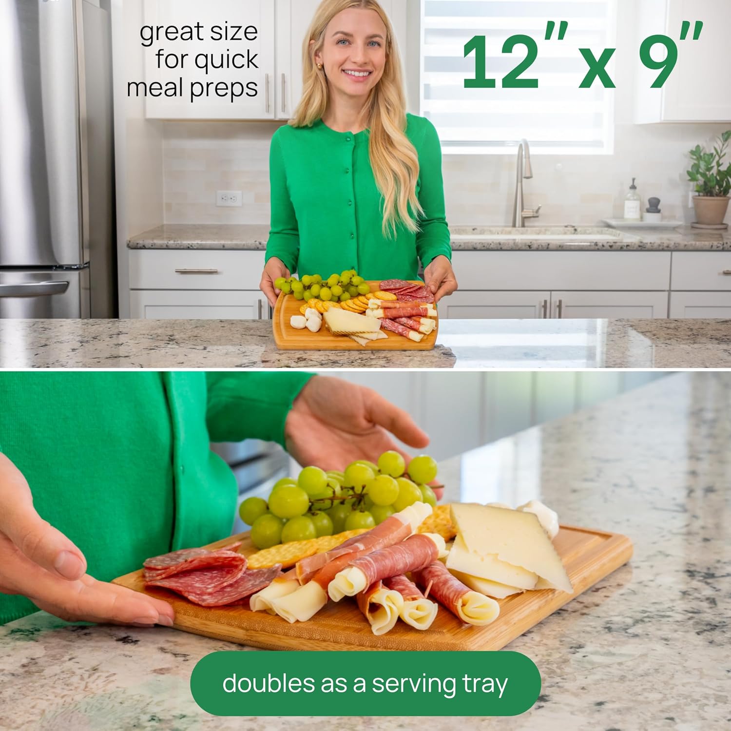 COMPACT & VERSATILE – At 12 inches, this glue-free surface bamboo cutting board is the go-to size for quick daily prep. Perfect for slicing fruit, chopping herbs, prepping kids’ snacks, or serving cheese and charcuterie, it delivers big utility without crowding your counter.